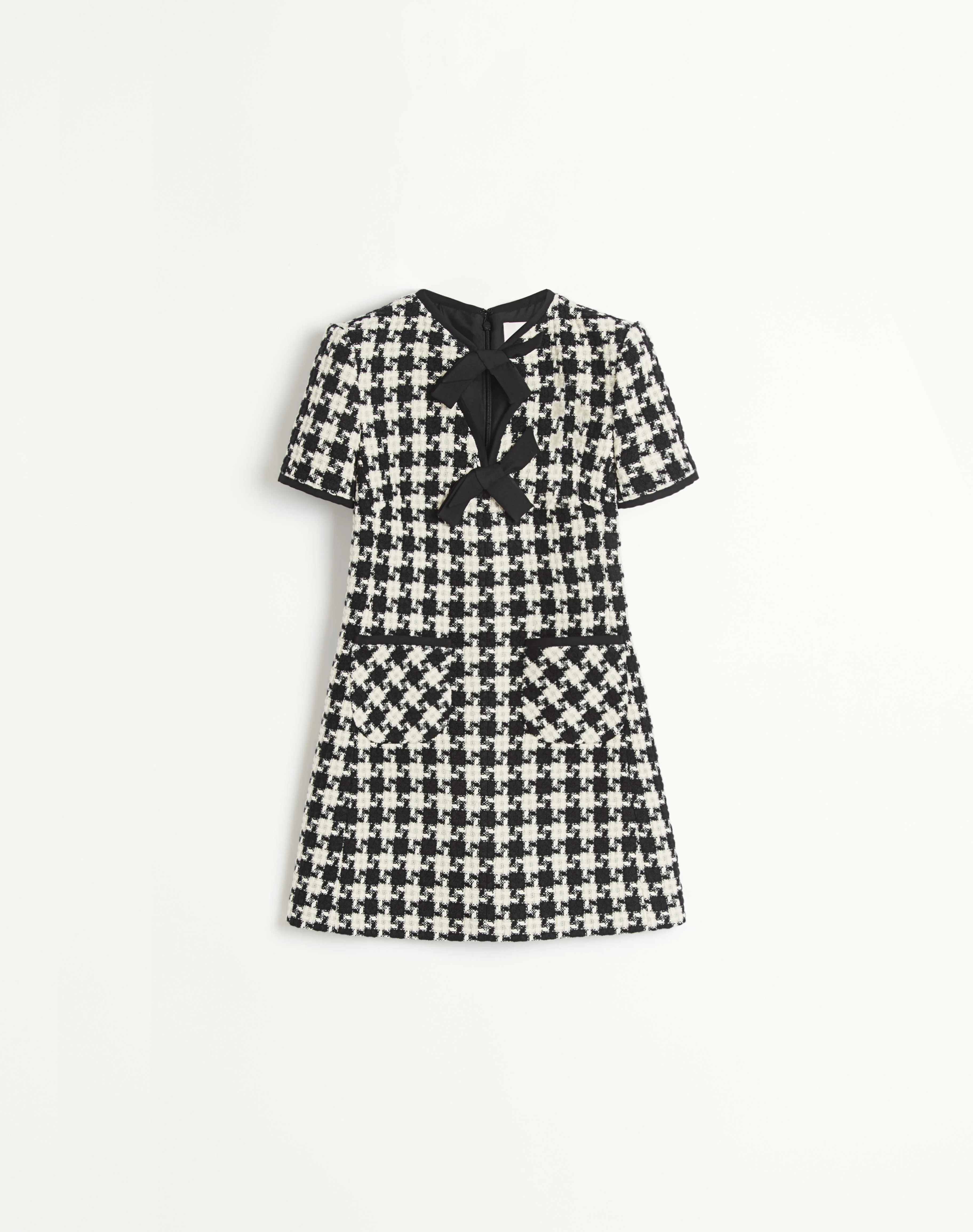 Damier Light Tweed Short Dress - Bow detail - Rear zipper and hook-and-eye fastening - Damier Light Tweed (40% Acrylic, 37% Virgin Wool, 19% Cotton, 4% Polyamide) - Lined - Length: 90 cm / 35.4 in. from the shoulders in an Italian size 40 - Sleeve length: 39.5 cm / 15.6 in. from the center back in an Italian size 40 - The model is 176 cm / 5'9" tall and wears an Italian size 40 - Made in Italy The look of the model is completed by a Valentino Garavani Nellcote Bag and Valentino Garavani Bowow Shoes. Product code: 6B3VAEV290K_0AN