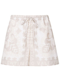 geometric-print drawstring shorts Highlights - White/beige - Silk-cotton blend - Geometric-pattern print - Elasticated drawstring waistband - Straight hem - Thigh-length Made in Italy Composition Body: Cotton 48% Silk 52% SIZE & FIT Model measurements Height 5 ft 9 in(1.76 m) Bust/Chest 31.49 in(80 cm) Hips 36.22 in(92 cm) Waist 24.8 in(63 cm) FittingInformation Designed for a slim fit that sits just away from the body offering a close yet comfortable fit Adjust this piece’s waistband to your preference using the drawstring Made from a midweight non-stretch fabric This piece fits true to size – take your usual size