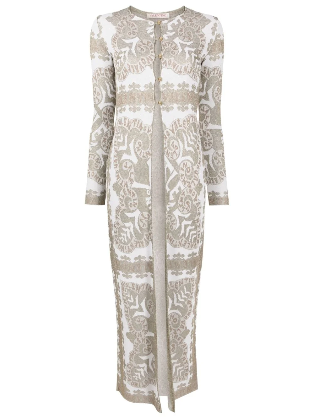 geometric-print metallic-finish cape Highlights - White/beige - Knitted construction - Metallic finish - Geometric-pattern print - All-over logo print - Round neck - Front button fastening - Long sleeves - Straight hem Made in Italy Composition Body: Viscose 81% Metallized Polyester 19% SIZE & FIT Model measurements Height 5 ft 9 in(1.76 m) Bust/Chest 31.49 in(80 cm) Hips 36.22 in(92 cm) Waist 24.8 in(63 cm) FittingInformation Designed for a slim fit that sits just away from the body offering a close yet comfortable fit Made from a midweight non-stretch fabric, this piece offers minimal elasticity when worn This piece fits true to size – take your usual size