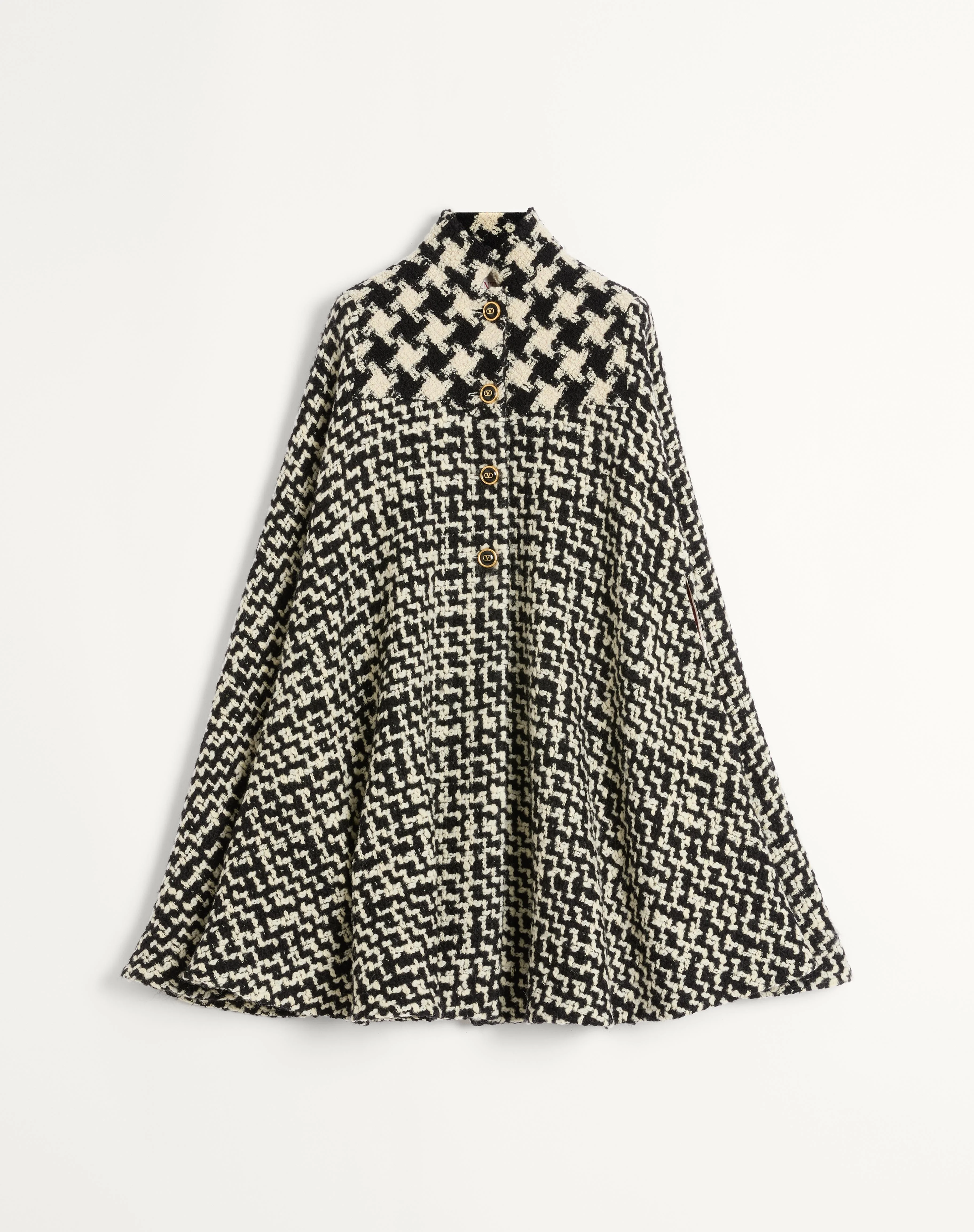 Geometric Tweed Cape - Macro Houndstooth detail on yoke - Front button closure - Geometric Tweed (98% Virgin Wool, 2% Polyamide) - Taffeta lining ( 100% Silk) - Length: 100 cm / 39.4 in. from the shoulders in an Italian size 40 - The model is 176 cm / 5'9" tall and wears an Italian size 40 - Made in Italy The look of the model is completed by a Valentino Garavani Vain Bag and Valentino Garavani Bowow Shoes. Product code: 6B3CG4K290W_0AN