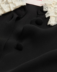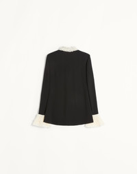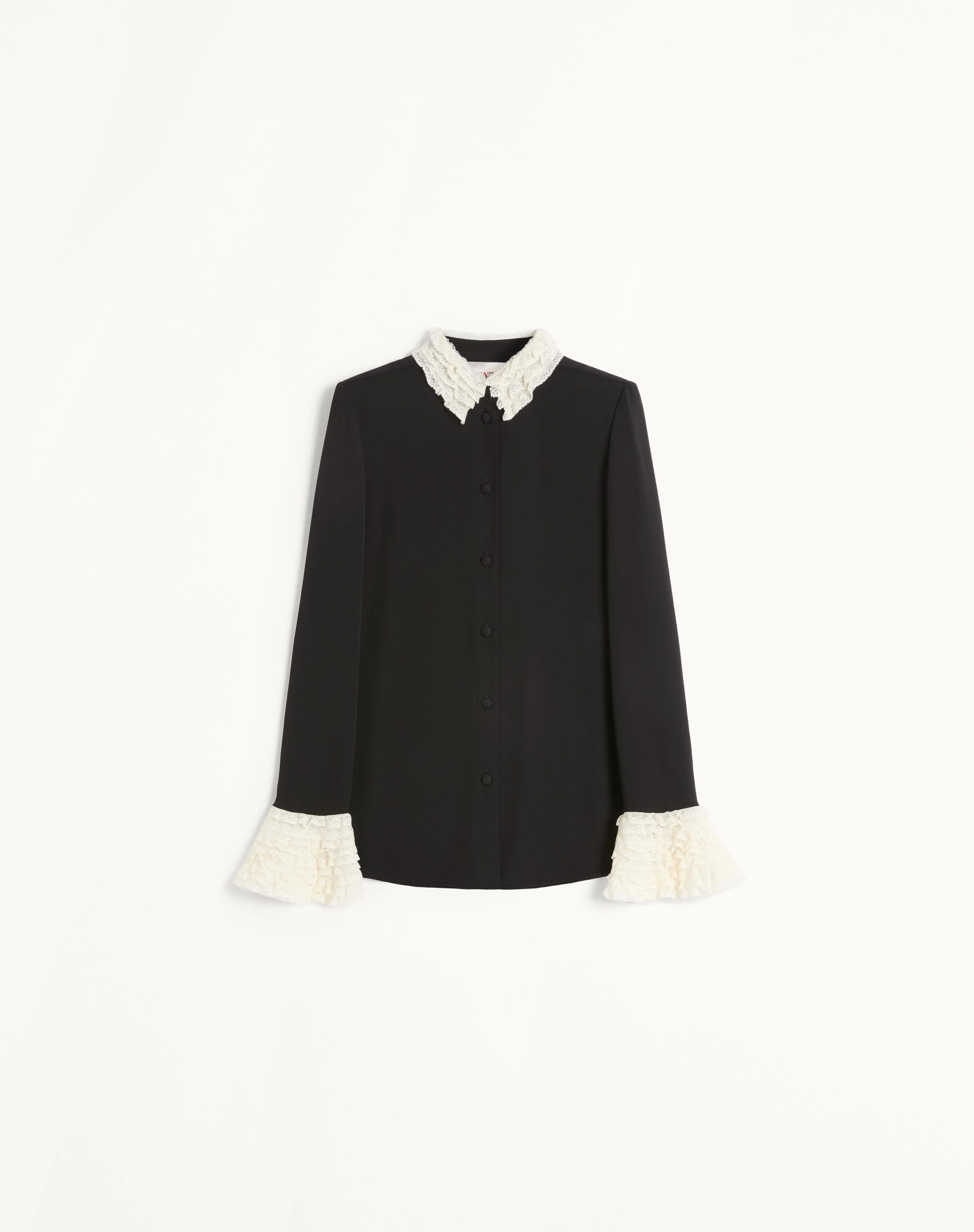 Long-sleeved Georgette shirt - Ruffle detail at cuffs and neck - Front closure with covered buttons - Georgette (100% Silk) - Unlined - Length: 66 cm / 25.9 in. from the shoulders in an Italian size 40 - Sleeve length: 83 cm / 32.6 in. from the center back in an Italian size 40 - The model is 176 cm / 5'9" tall and wears an Italian size 40 - Made in Italy The look of the model is completed by a Valentino Garavani Vain Bag and Valentino Garavani Bowow Shoes. Product code: 6B3AB7321MH_0NA