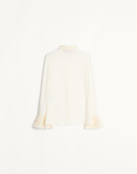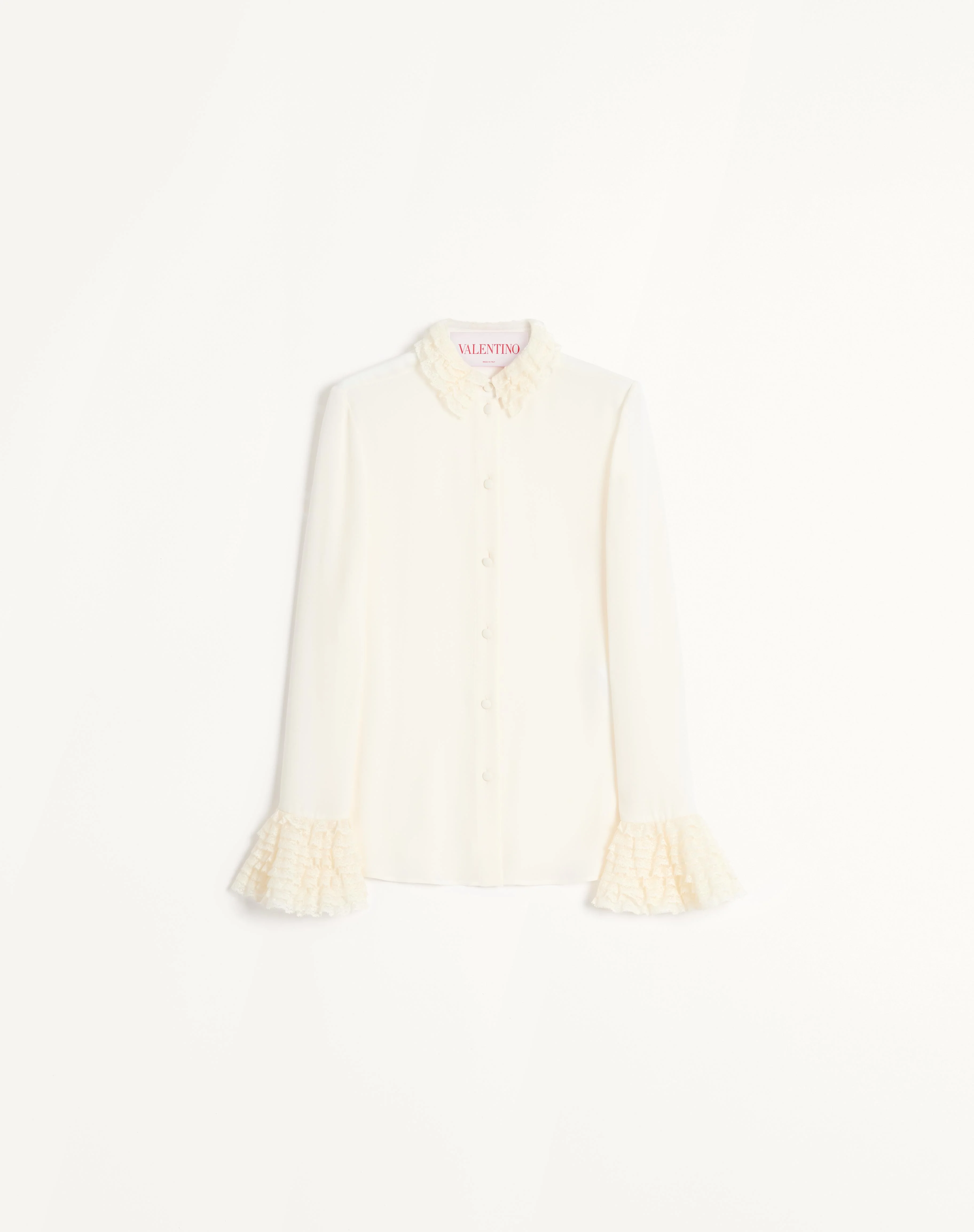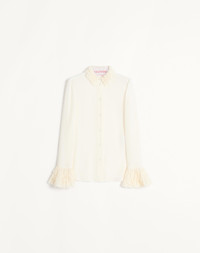 Long-sleeved Georgette shirt - Ruffle detail at cuffs and neck - Front closure with covered buttons - Georgette (100% Silk) - Unlined - Length: 66 cm / 25.9 in. from the shoulders in an Italian size 40 - Sleeve length: 83 cm / 32.6 in. from the center back in an Italian size 40 - The model is 176 cm / 5'9" tall and wears an Italian size 40 - Made in Italy The look of the model is completed by a Valentino Garavani Vain Bag and Valentino Garavani Bowow Shoes. Product code: 6B3AB7321MH_A03