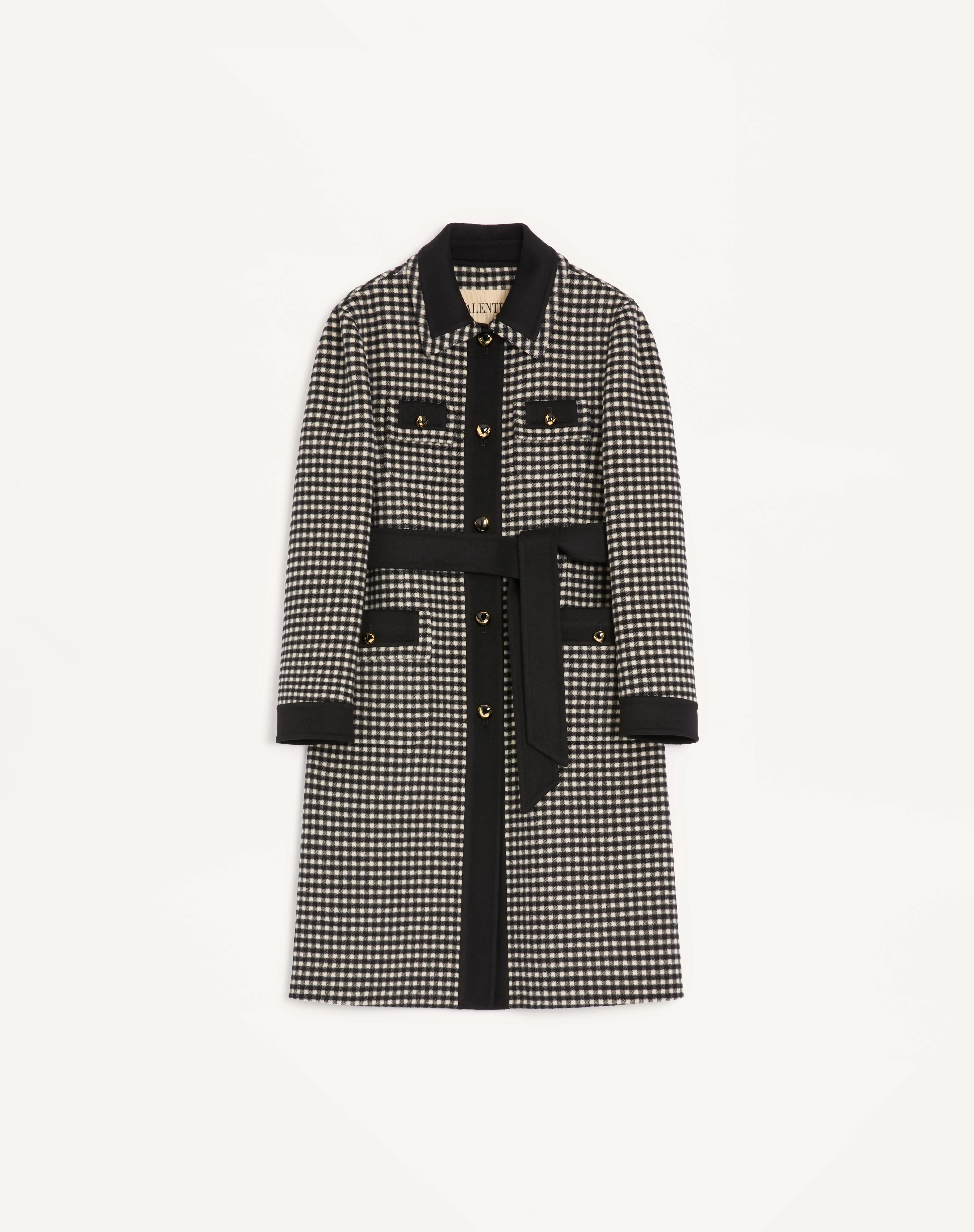 Micro Vichy coat with Compact Drap inserts - Front closure with VLogo buttons - Single-breasted with integrated belt - Micro Vichy (100% Virgin Wool) - Unlined - Length: 98 cm / 38.6 in. from the shoulders in an Italian size 40 - The model is 176 cm / 5'9" tall and wears an Italian size 40 - Made in Italy The look of the model is completed by a Valentino Garavani VSLING Bag and Valentino Garavani Bowow Shoes. Product code: 7B3CA7S09F1_0AN