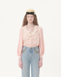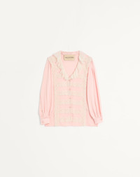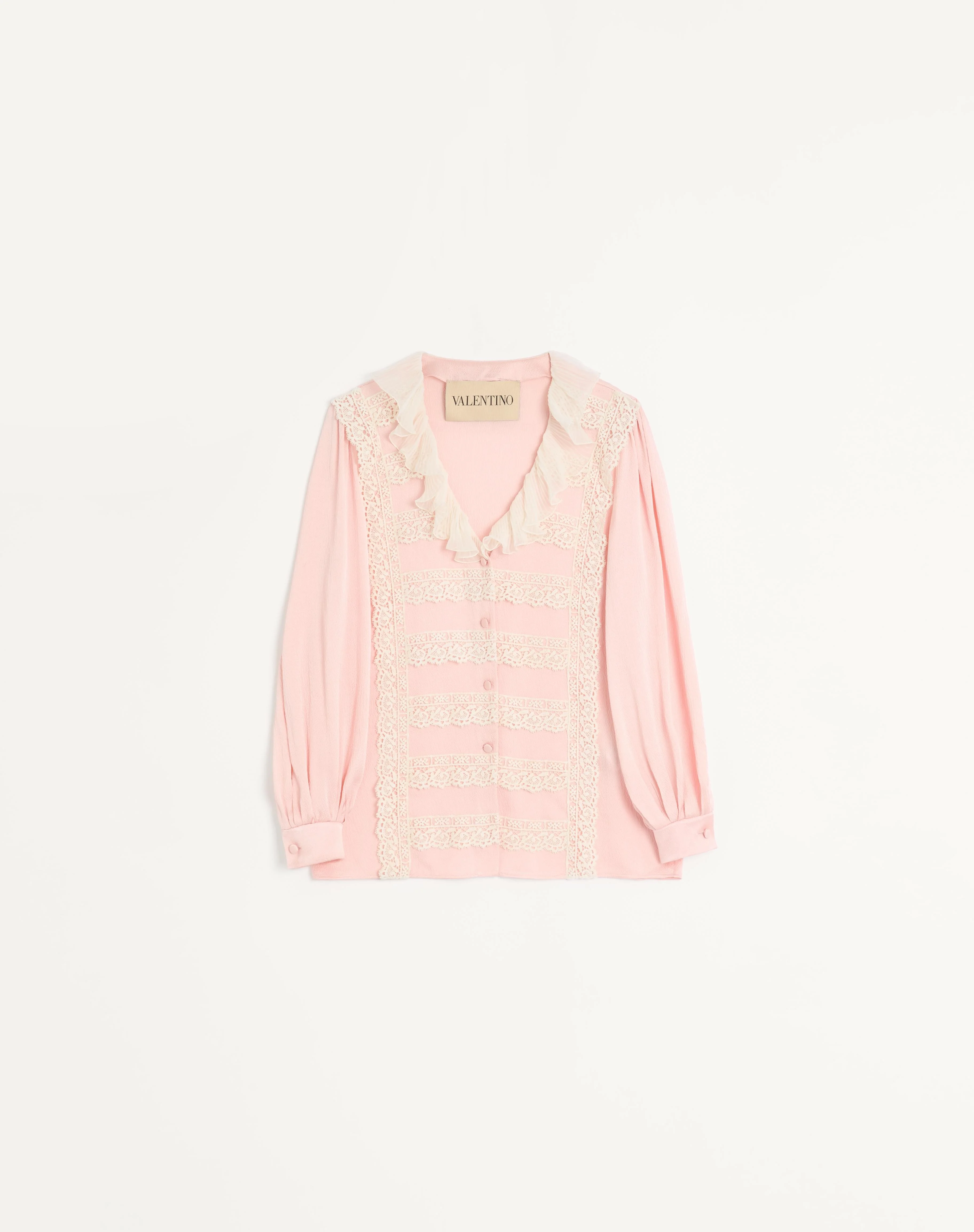 Hammered Satin Shirt with Lace Inserts - Chiffon ruffle detail on the neckline - Front button closure - Hammered Satin (100% Silk) - Length: 65 cm / 25.6 in. from the shoulders in an Italian size 40 - The model is 176 cm / 5'9" tall and wears an Italian size 40 - Made in Italy The look of the model is completed by a Valentino Garavani Vain Bag and Valentino Garavani Hi Dolly Shoes. Product code: 7B3AB7W09AY_0P7
