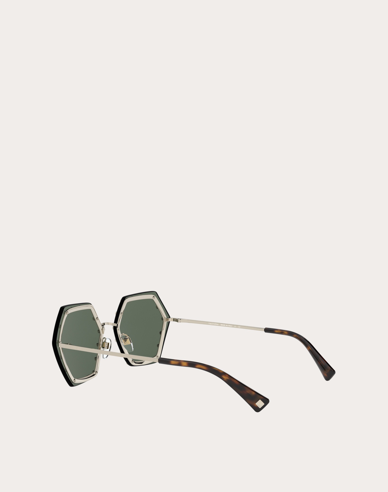 Hexagonal-shaped metal glasses with crystal studs. Oversize lenses in an ultra-lightweight metal frame. 100% UV protection. Made in Italy. Product Code 0VA2035_25B