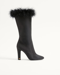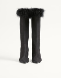 Valentino Garavani Hotty boot in shantung fabric (100% silk) with feathers - VLogo Signature detail with antique-effect brass finish - Inner side zipper - Heel height: 100 mm /4 in. - Boot shaft height: 29cm / 11 in.; Italian size 37 - Made in Italy Product code: 8W2S0NT3ZGE_N01
