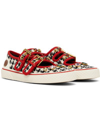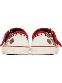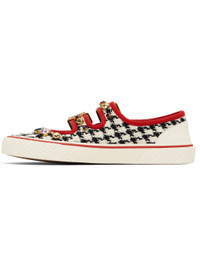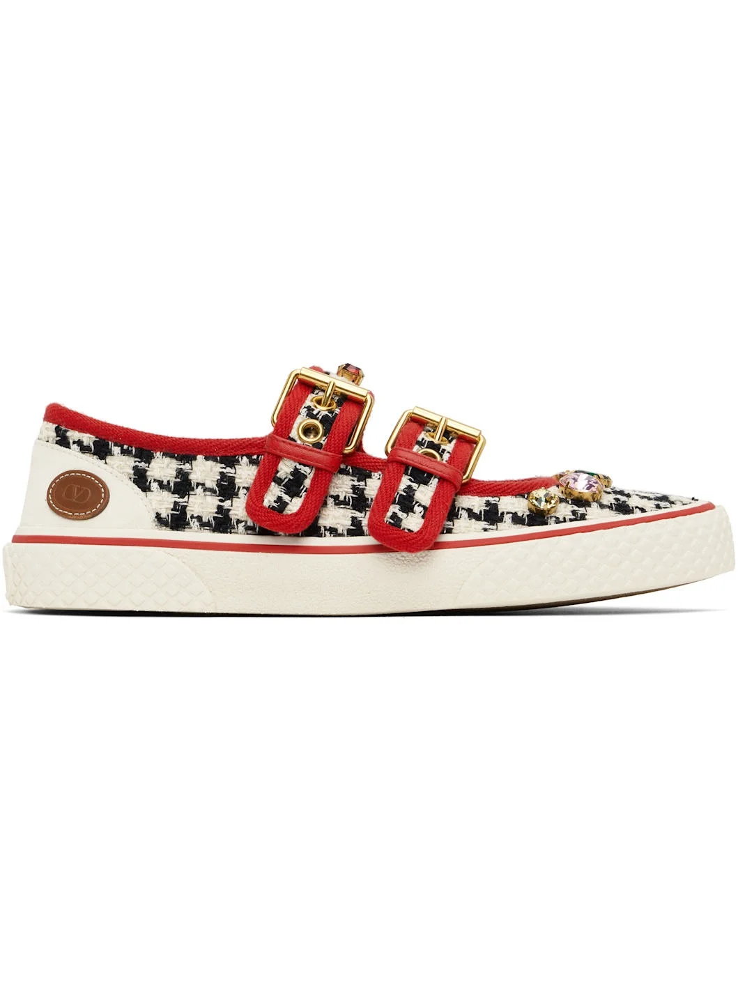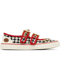 Low-top tweed Mary Jane-style sneakers in off-white and black. · Webbing trim in red throughout · Crystal-cut accents at vamp and straps · Adjustable pin-buckle straps at vamp · Leather logo patch at outer side · Leather and jersey lining · Logo-embossed texture rubber midsole · Treaded rubber sole Supplier color: Bianco/Nero Upper: textile, leather. Sole: rubber. Made in Spain 251807F128006