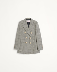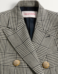 Houndstooth Wool Blazer - Full canvas construction - Double-breasted - Front closure with jewel buttons - Houndstooth Wool (100% Virgin Wool) - Crepe de Chine V Logo lining (75% Acetate, 25% Silk) - Length: 71 cm / 28 in. from the shoulders in an Italian size 40 - Sleeve length: 80 cm / 31.5 in. from the center back in an Italian size 40 - The model is 176 cm / 5'9" tall and wears an Italian size 40 - Made in Italy The look of the model is completed by a Valentino Garavani Quiltie 67 Bag and Valentino Garavani Pattie Shoes. Product code: 6B3CE40090U_0AN