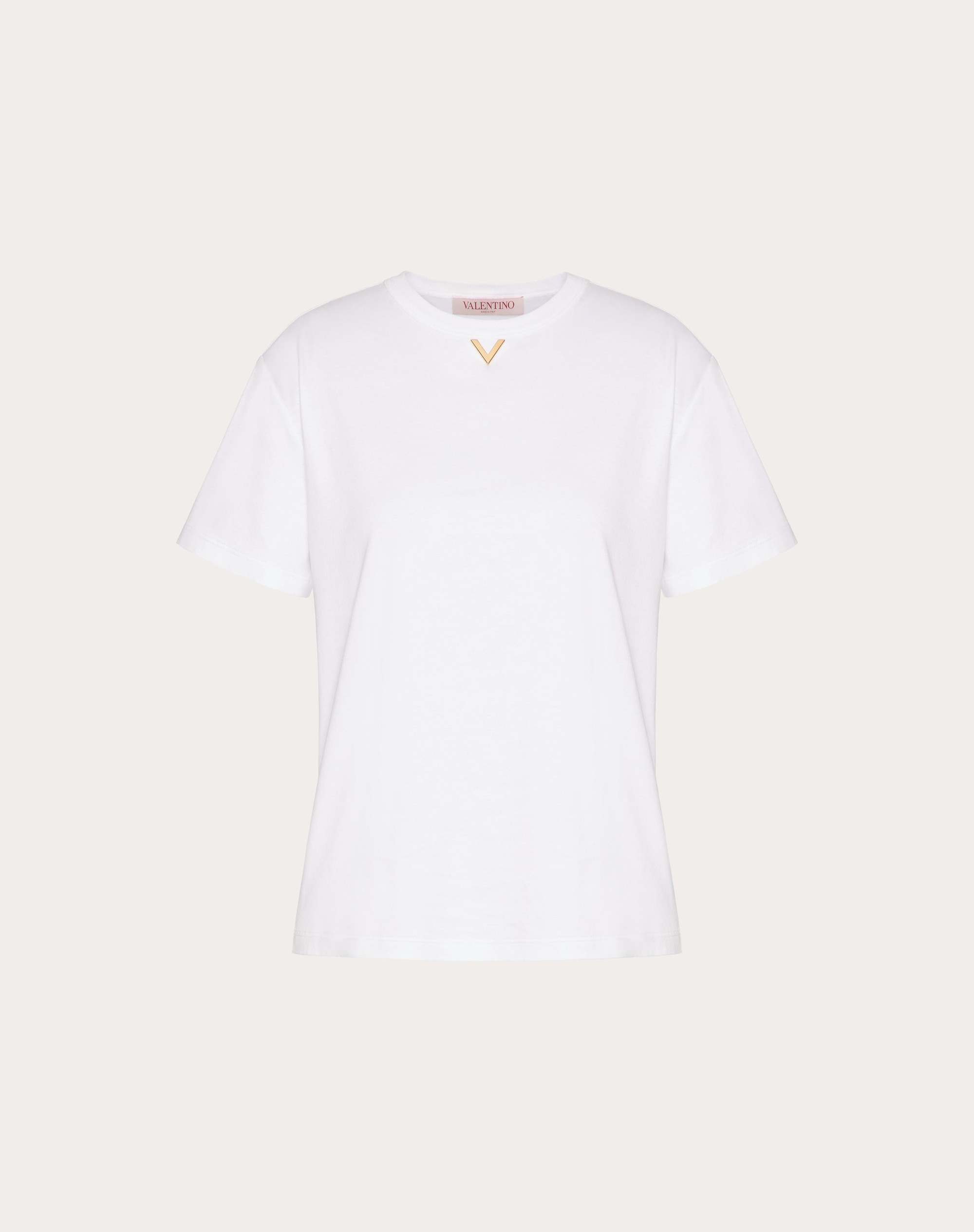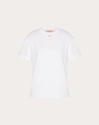Jersey Cotton T-shirt - V Gold front detail - Jersey Cotton (100% cotton) - Length: 60 cm / 23.6 in. from the shoulders in an Italian size S - Sleeve length: 38 cm / 14.9 in. from the center back in an Italian size S - The model is 176 cm / 5'9" tall and wears an Italian size S - Made in Italy The look of the model is completed by a Valentino Garavani Rockstud Wispy Bag and Valentino Garavani VLogo Easyjog Shoes. Product code: 5B3MG23K8PA_0BO