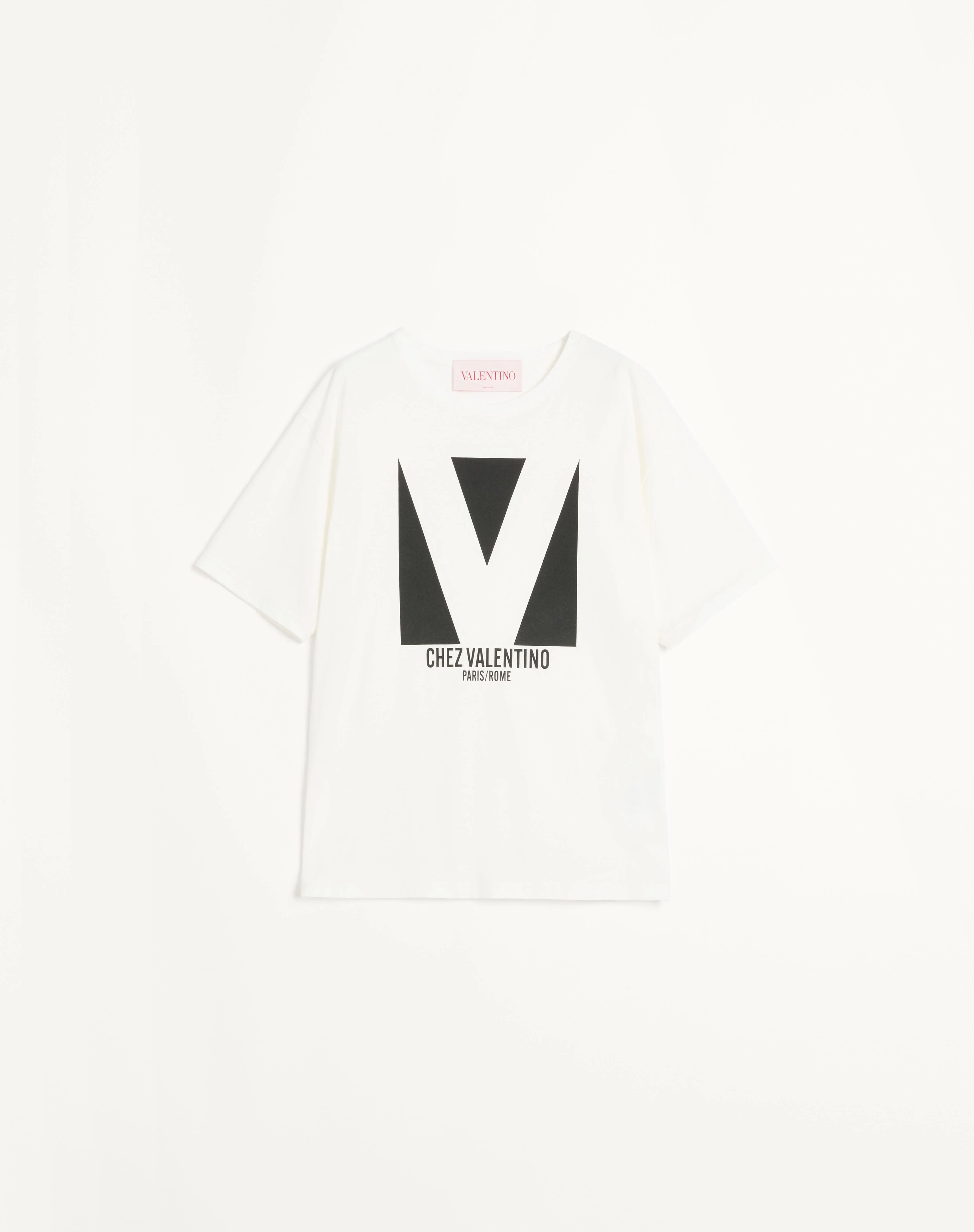 Jersey Cotton T-Shirt - Chez Valentino print - Jersey Cotton (100% Cotton) - Length: 70 cm / 27.5 in. from the shoulders in an Italian size S - Sleeve length: 50 cm / 19.6 in. from the center back in an Italian size S - The model is 176 cm / 5'9" tall and wears an Italian size S - Made in Italy The look of the model is completed by a Valentino Garavani Viva Superstar Bag and Valentino Garavani Ladycrush Shoes. Product code: 6B3MG24H95W_A03