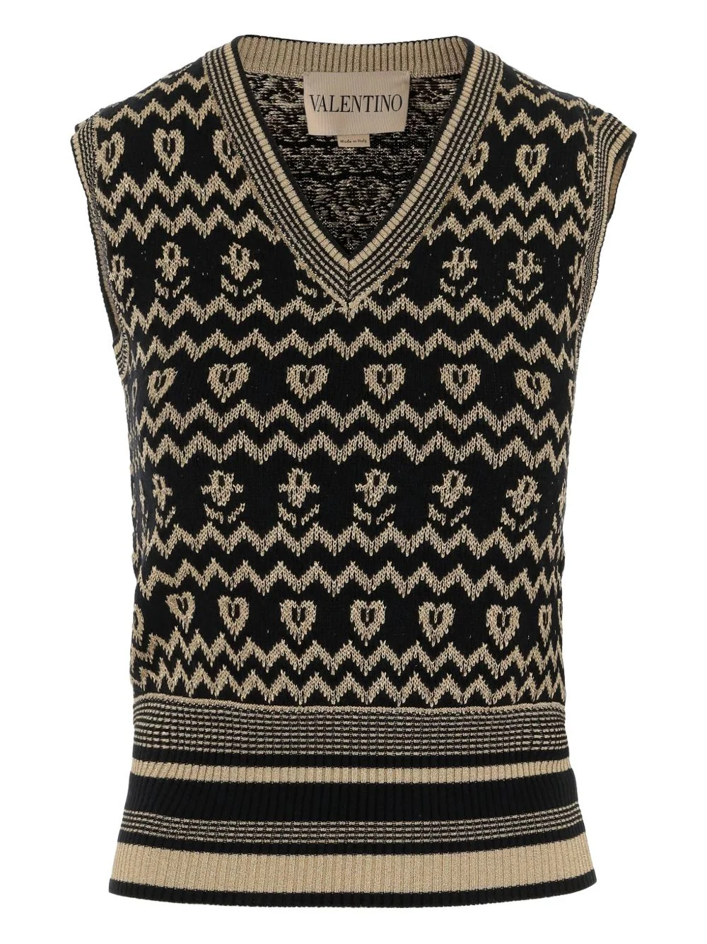 knit vest Highlights - Black and beige - Wool-blend - V-neck - Sleeveless - Straight hem Made in Italy Composition Wool 85%, Viscose 12%, Metallised Fibres 3% Washing instructions Read Manufacturer Guidelines