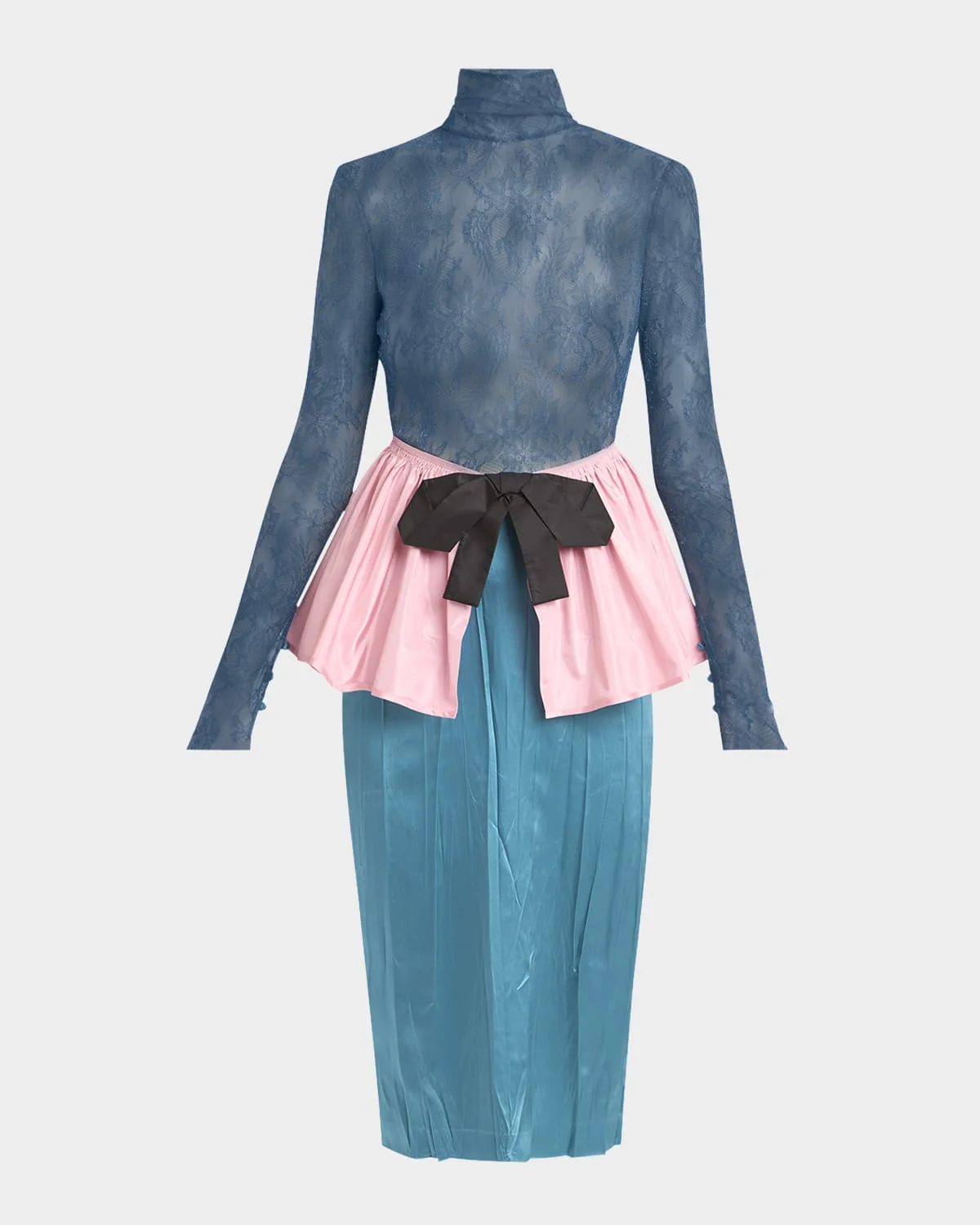 - Valentino Garavani dress featuring a sheer lace bodice and colorblock satin peplum skirt with a bow - Turtleneck - Long sleeves - Sheath silhouette - Knee length - Walking vent back - Button/keyhole back - Silk - Made in Italy