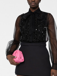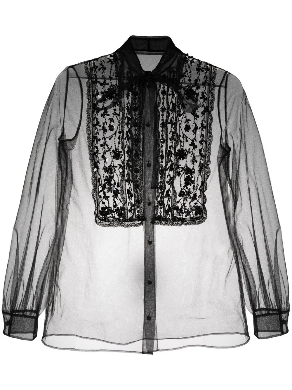 lace-embroidered sheer top Valentino Garavani presents a contemporary design with this top from the label's AW22 collection. This sheer construction is decorated with floral-lace embroidery for an elevated finish. Highlights - Valentino ready to wear - Black - Semi-sheer construction - Floral-lace detailing - Sequin embellishment - Classic collar - Front button fastening - Long sleeves Made in Italy Composition Polyester 100% SIZE & FIT Model measurements Height 5 ft 10 in(1.77 m) Bust/Chest 32.28 in(82 cm) Hips 35.03 in(89 cm) Waist 25.19 in(64 cm) FittingInformation This piece fits true to size. We recommend you get your regular size Cut for a loose fit Made with a lightweight non-stretch fabric