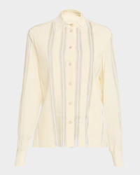 - Valentino Garavani pleated crepe de chine shirt featuring lace stripe insets - Point collar; button front - Long sleeves; button cuffs - Yoked back; box pleat - Relaxed fit - Silk/mother-of-pearl - Made in Italy