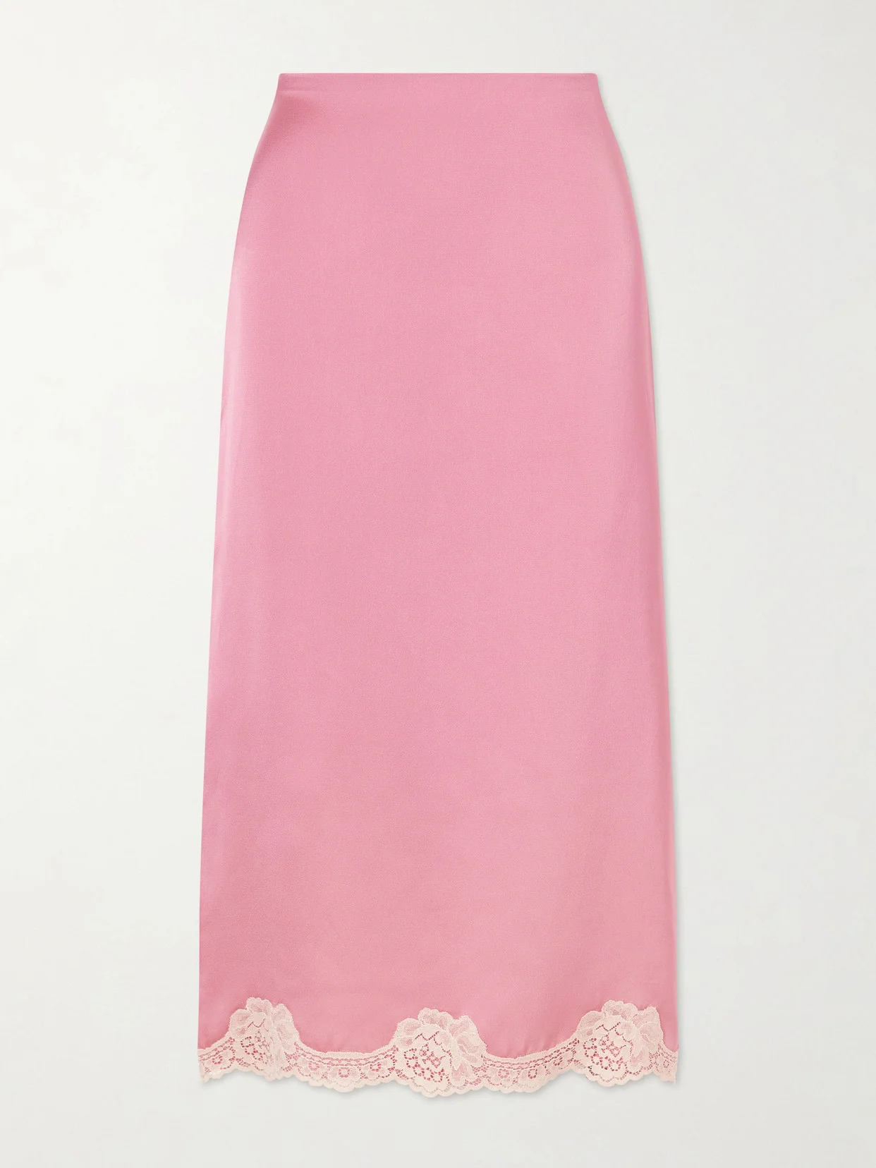 Valentino Garavani's midi skirt blends timeless elegance with delicate detail. Cut from lustrous cady, it's finished with a soft blush lace hem that adds subtle texture and romantic flair to the fitted silhouette. The fluid cut enhances movement, making it versatile for day or evening styling.