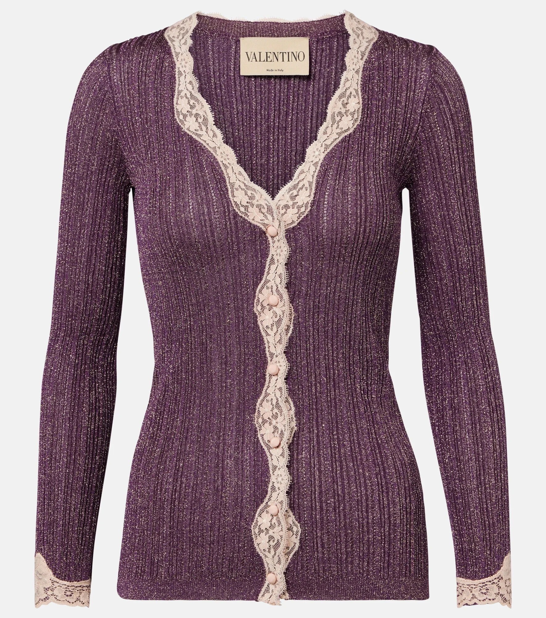 Valentino has become a symbol of crafting excellence, creativity, and uniqueness. This elegant cardigan is knitted with light-catching metallic fibres into a fitted silhouette with delicate lace trims. Product Details - Material: 81% viscose, 19% metallic fibres - Care instructions: dry clean - Made in Italy - Color: purple - Designer color name: Aubergine/Gold - Lace: 47% polyamide, 41% cotton, 12% elastane - Details: 91% polyamide, 9% elastane - Closure: buttoned front - Item number: P01165969 Size & Fit - True to size - Fitted - Stretchy fabric - Falls below the hip - The model seen in the picture is 178cm-5'10" and wearing a size XS