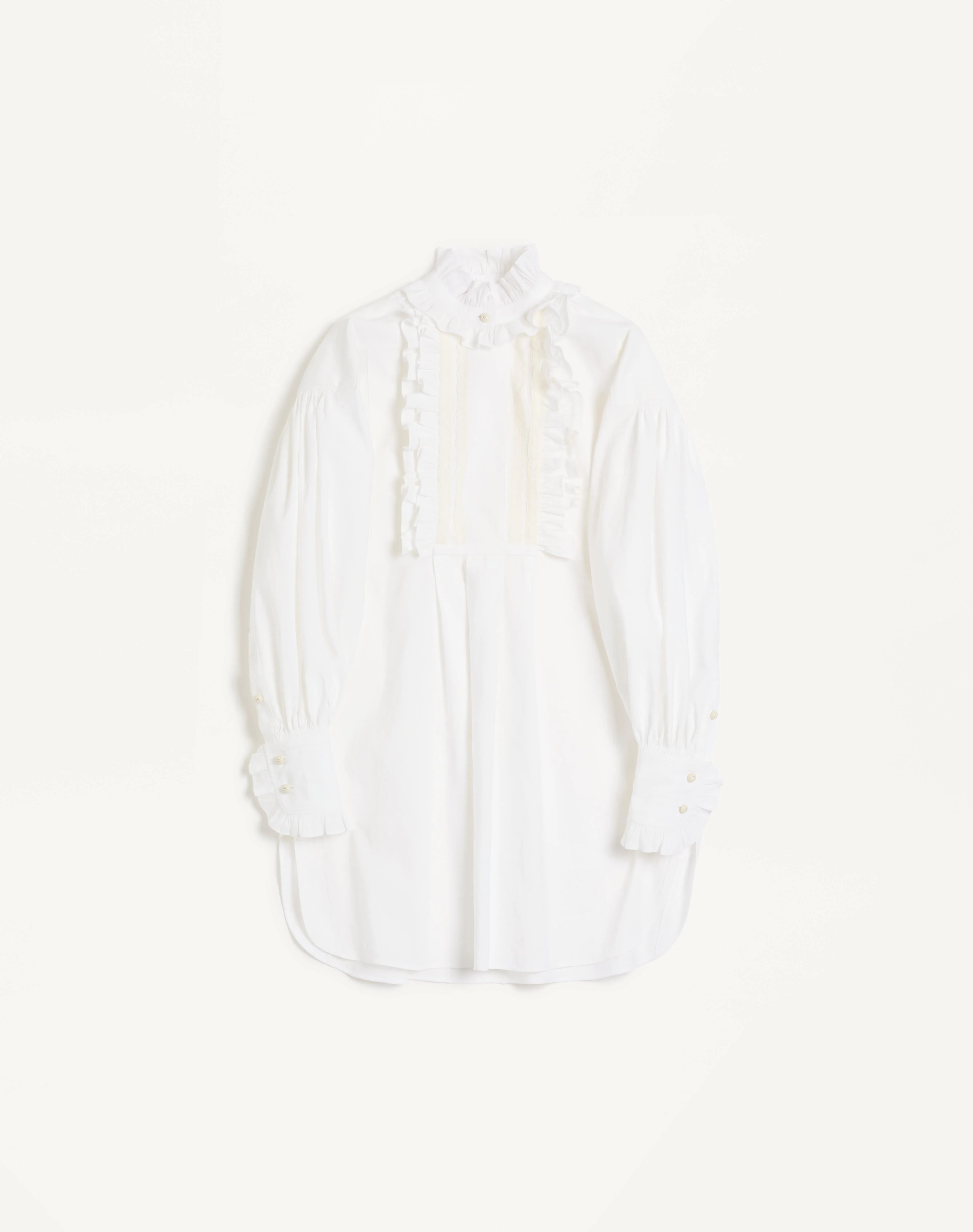 Short Dress in Cotton and Linen - Front ruffle detail - Loose fit - Front polo closure with buttons - Cotton and Linen (53% Cotton, 45% Linen, 2% Silk) - Length: 85 cm / 33.5 in. from the shoulders in an Italian size 40 - The model is 176 cm / 5'9" tall and wears an Italian size 40 - Made in Italy The look of the model is completed by a Valentino Garavani 9TO5 Bag and Valentino Garavani Bowow Shoes. Product code: 6B3VAUF590D_0BO