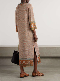 EDITORS'NOTES Valentino Garavani's dress references bohemian '70s styles. Intarsia-knitted with flecks of metallic thread, it's patterned with chevrons through the body and ornate borders. The three-quarter sleeves and slit midi hem take cues from kaftans, so it makes a great choice for vacation. SIZE & FIT Model measurements: - Fits true to size, take your normal size - Designed for a loose fit - Lightweight, non-stretchy fabric - Model is 177cm/ 5'10" and is wearing a size XSmall - Bust: 80cm/ 31.5" - Waist: 60cm/ 23.5" - Hip: 89cm/ 35" DETAILS & CARE - Orange, green and white intarsia-knit - Slips on - 91% viscose, 9% metallic fibers; lining: 91% viscose, 9% elastane - Dry clean