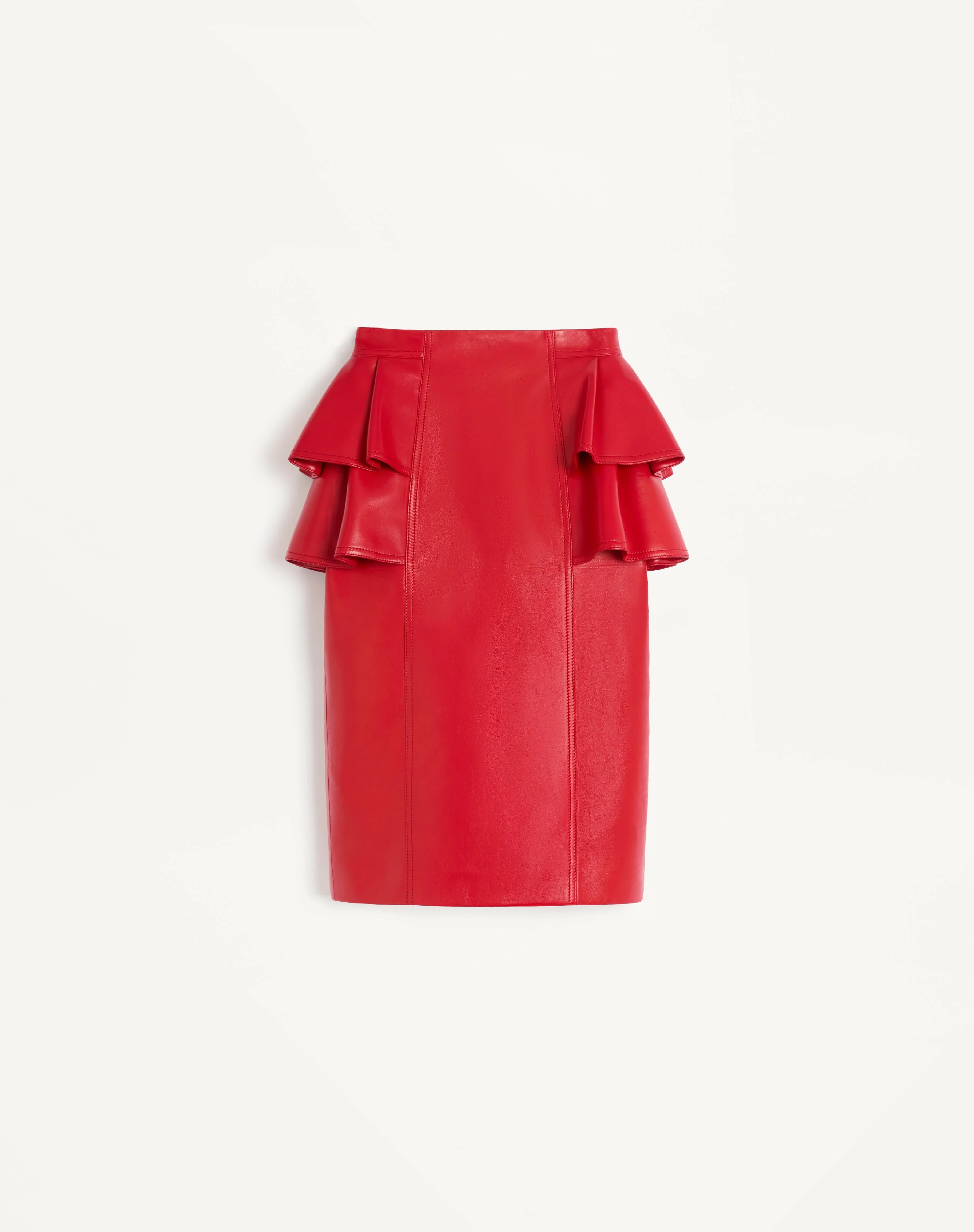 Leather midi skirt with side ruffles - Rear zipper closure - Leather (100% Lambskin) - Jacquard Flower VLogo Lining (75% Acetate, 25% Silk) - Length: 65.5 cm / 25.8 in. from the waist in an Italian size 40 - The model is 176 cm / 5'9" tall and wears an Italian size 40 - Made in Italy The look of the model is completed by a Valentino Garavani Viva Superstar Bag and Valentino Garavani Hi Dolly Shoes. Product code: 7B3NI07V9G6_157