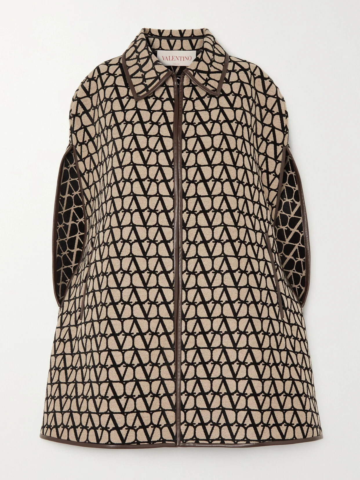 Valentino's cape is jacquard-woven with the label's logo in black and beige threads. Outlined with smooth brown leather, it has a breezy shape that's perfect for layering. Style yours with the coordinating hat and bralette.