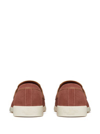Leisure Flows leather loafers These brown suede Valentino Garavani loafers are embellished with a tonal VLogo Signature plaque at the top strap – the heritage motif first debuted at the Sala Bianca show in 1968 and remains a steadfast house emblem.They’re reinforced with gilded leather trims and rest on contrasting white rubber soles with a slight heel. Highlights - Brown - Calf suede - Vlogo signature - Leather trim - Round toe - Branded insole - Contrasting rubber sole Made in Italy Composition Leather 100% SIZE & FIT Measurement HEEL 0.98 in(2.5 cm) Sole height 0.39 in(1 cm) Washing instructions Read Manufacturer Guidelines