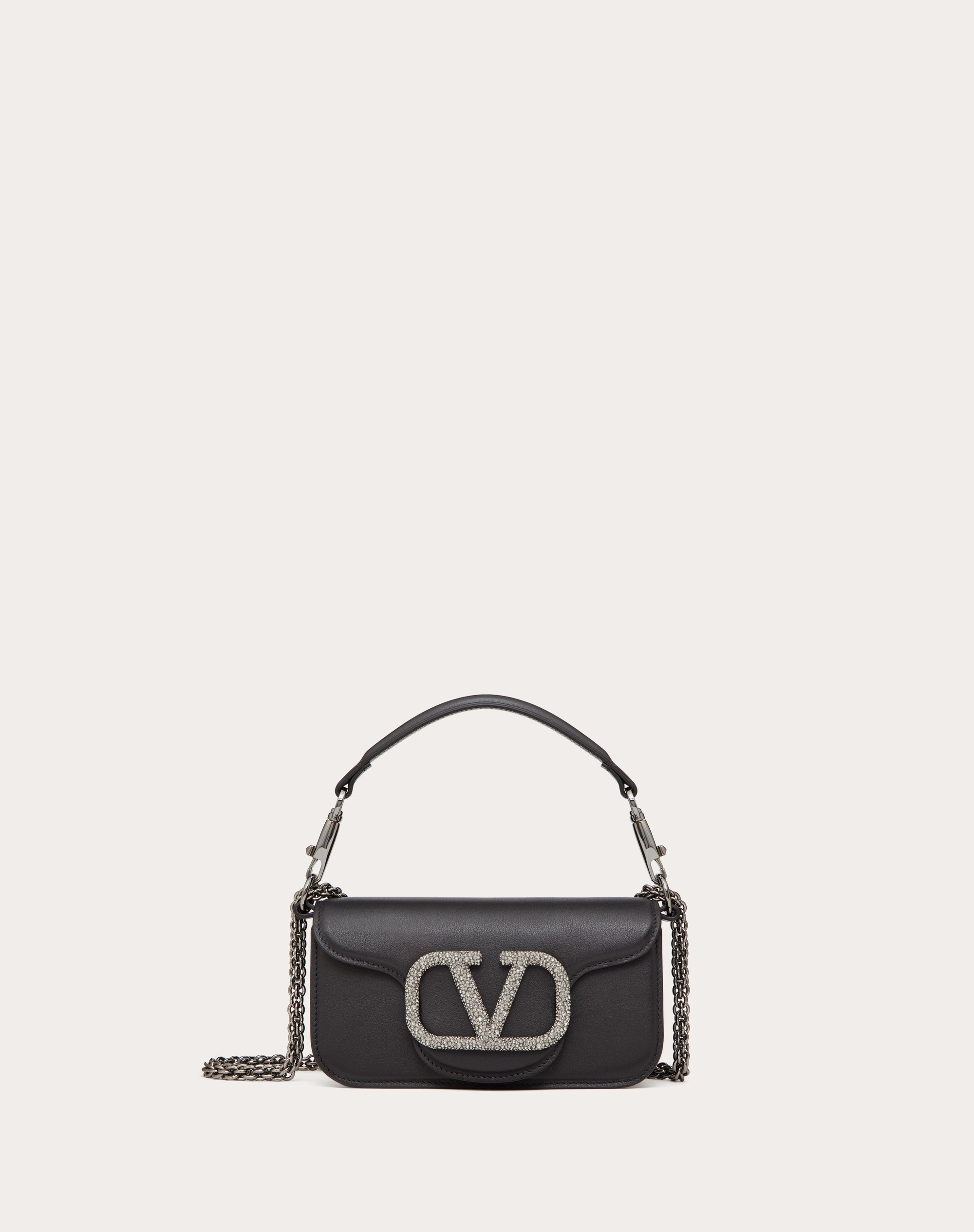 Valentino Garavani Loco small shoulder bag in calfskin with VLogo Signature element covered with Swarovski® crystals. Equipped with both a detachable sliding chain strap and a detachable handle, this accessory can be worn as a crossbody/shoulder bag or carried as a handbag. Ruthenium-finish hardware - Magnetic closure - Removable leather handle - Shoulder strap with removable sliding chain - Nappa leather lining. Interior: one slip pocket Shoulder strap drop length: min. 33 cm to max. 55 cm / min. 12.9 in. to max. 21.6 in. - Dimensions: W20xH11xD5 cm / W7.8xH4.3xD1.9 in. - Made in Italy Product code: 3W2B0K53CWR_249