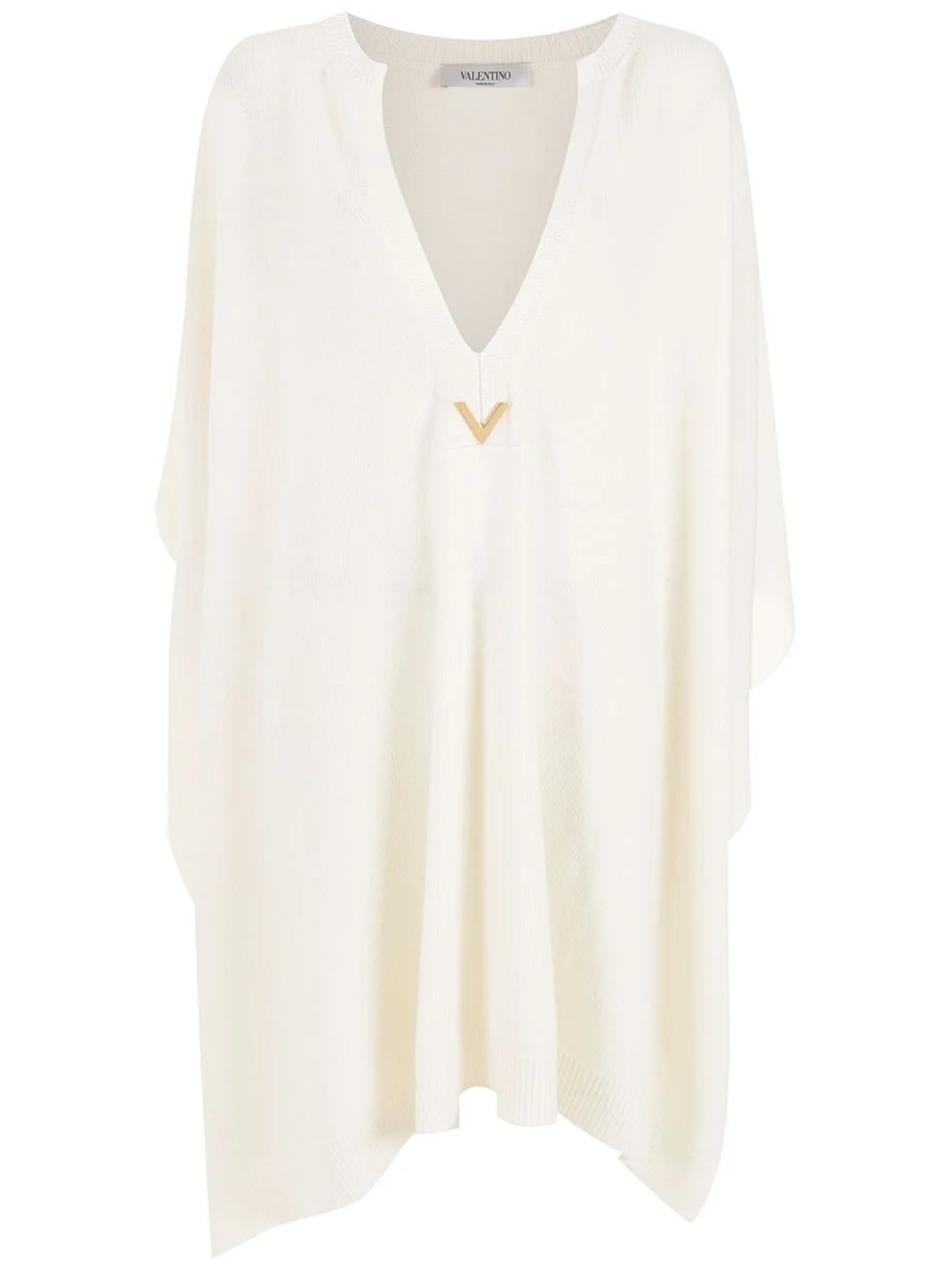 logo-plaque knitted poncho Valentino Garavani showcases the brands use of impeccable craftsmanship in this knitted poncho with ribbed detailing. Featuring a gold-tone hardware logo plaque at the front, it punctuates the design with a simple yet instantly recognisable detail. Highlights - Valentino ready to wear - White - Cashmere - Logo plaque - Gold-tone hardware - Round split neck - Ribbed detailing - Handkerchief hem Made in Italy Composition Virgin Wool 70%, Cashmere 30% SIZE & FIT Model measurements Height 5 ft 10 in(1.77 m) Bust/Chest 31.1 in(79 cm) Hips 37 in(94 cm) Waist 25.98 in(66 cm) Measurement LENGTH 45.27 in(115 cm) Shoulder Width 51.96 in(132 cm) SLEEVE LENGTH 22.83 in(58 cm) FittingInformation This piece fits true to size. We recommend you get your regular size Cut for a loose fit Made with a mid-weight fabric Washing instructions Read Manufacturer Guidelines