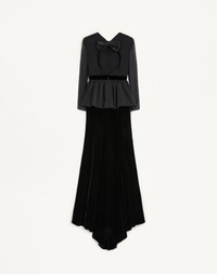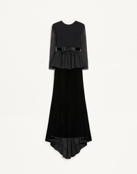 Long dress in Sable Velvet with Crepponne Chiffon bodice and Faille ruffle - Velvet belt - Duchesse bow detail - Low back - Rear zipper and hook-and-eye closure - Sable Velvet (69% Viscose, 31% Cupro) - Georgette Stretch lining (91% Silk, 9% Elastane) - Length 116 cm / 45.7 in. from the waist in an Italian size 40 - The model is 176 cm / 5'9" tall and wears an Italian size 40 - Made in Italy The look of the model is completed by Valentino Garavani Dans Le Foyer Shoes. Product code: 7B0VDMA09Q9_0NO