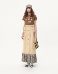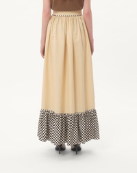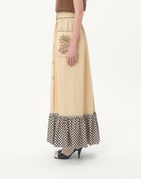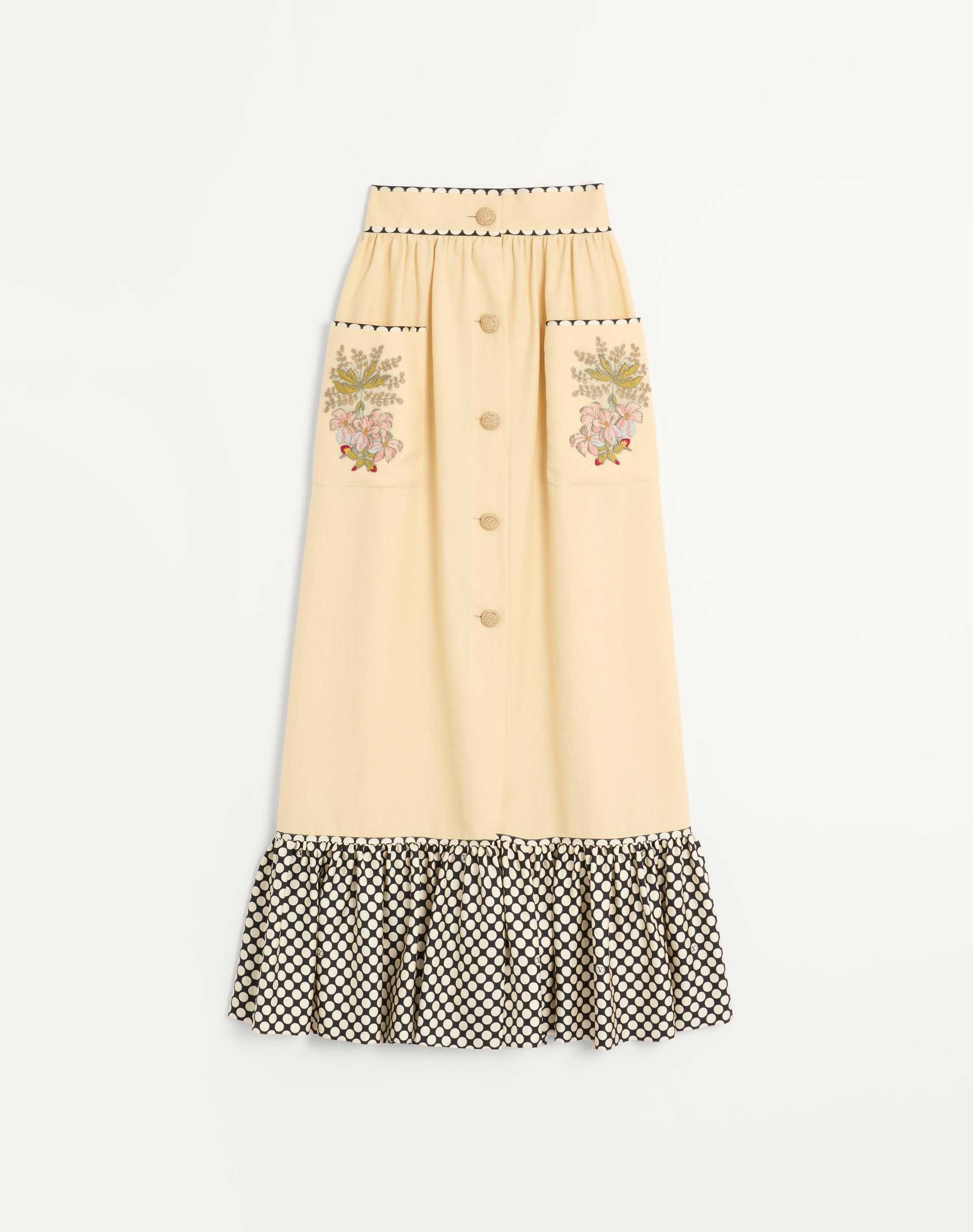 Long skirt with floral thread embroidery - Bottom flounce and edges in Plus de Pois print Twill - Front closure with VLogo buttons - Viscose Linen (86% Viscose, 14% Linen) - Unlined - Length: 102 cm / 20.2 in. from the waist in an Italian size 40 - The model is 176 cm / 5'9" tall and wears an Italian size 40 - Made in Italy Product code: 7B3RADW19EK_R0R