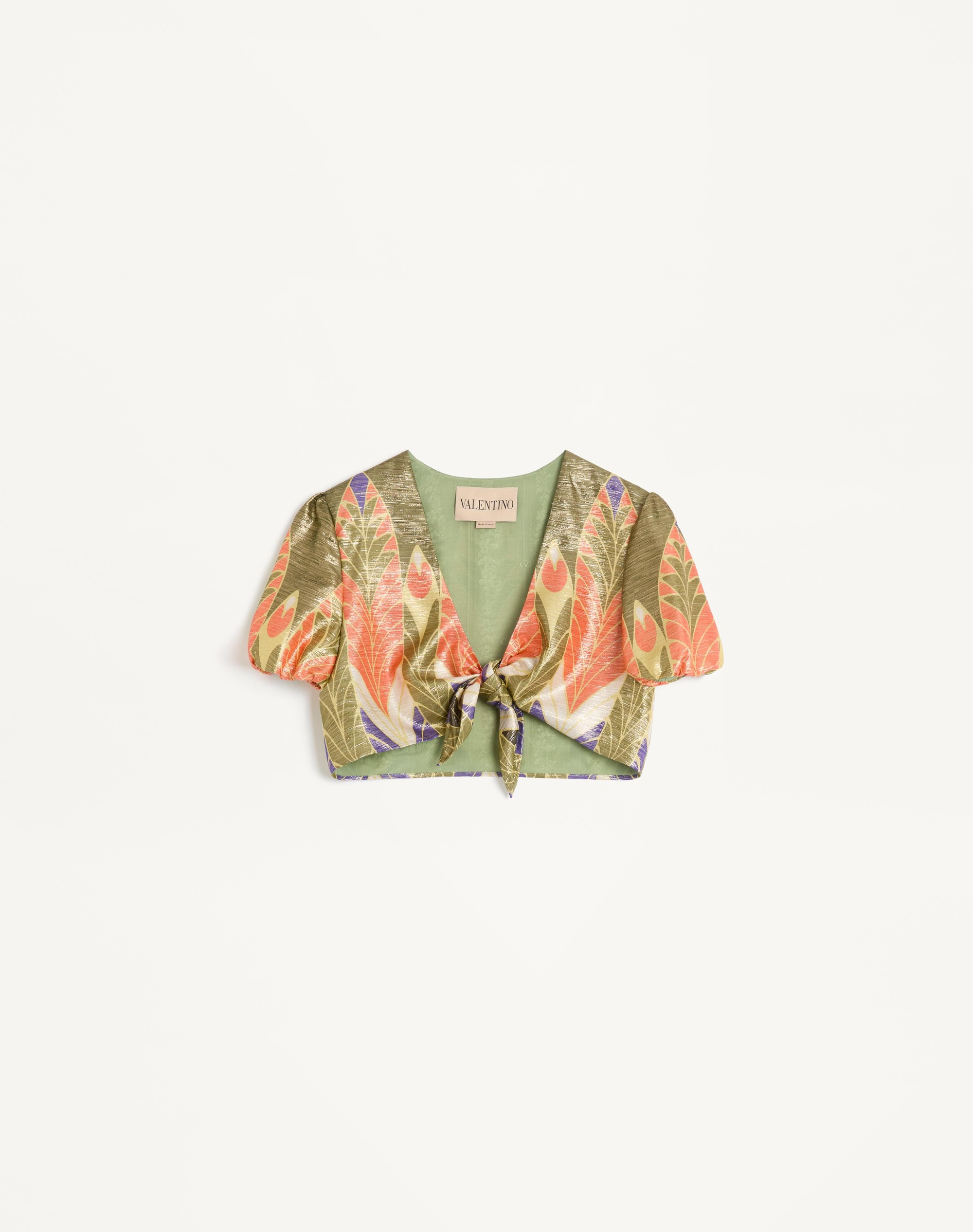 Lurex top with Voyage Imaginaire print - Front closure with bow - Voyage Imaginaire Liberty Lurex (82% Silk, 18% Metallic Fiber) - VLogo lining with Flowers and Stripes (74% Acetate, 26% Silk) - Length: 37.5 cm / 14.8 in. from the shoulders in an Italian size 40 - The model is 176 cm / 5'9" tall and wears an Italian size 40 - Made in Italy Product code: 7B3AEAZ19NF_B8Z