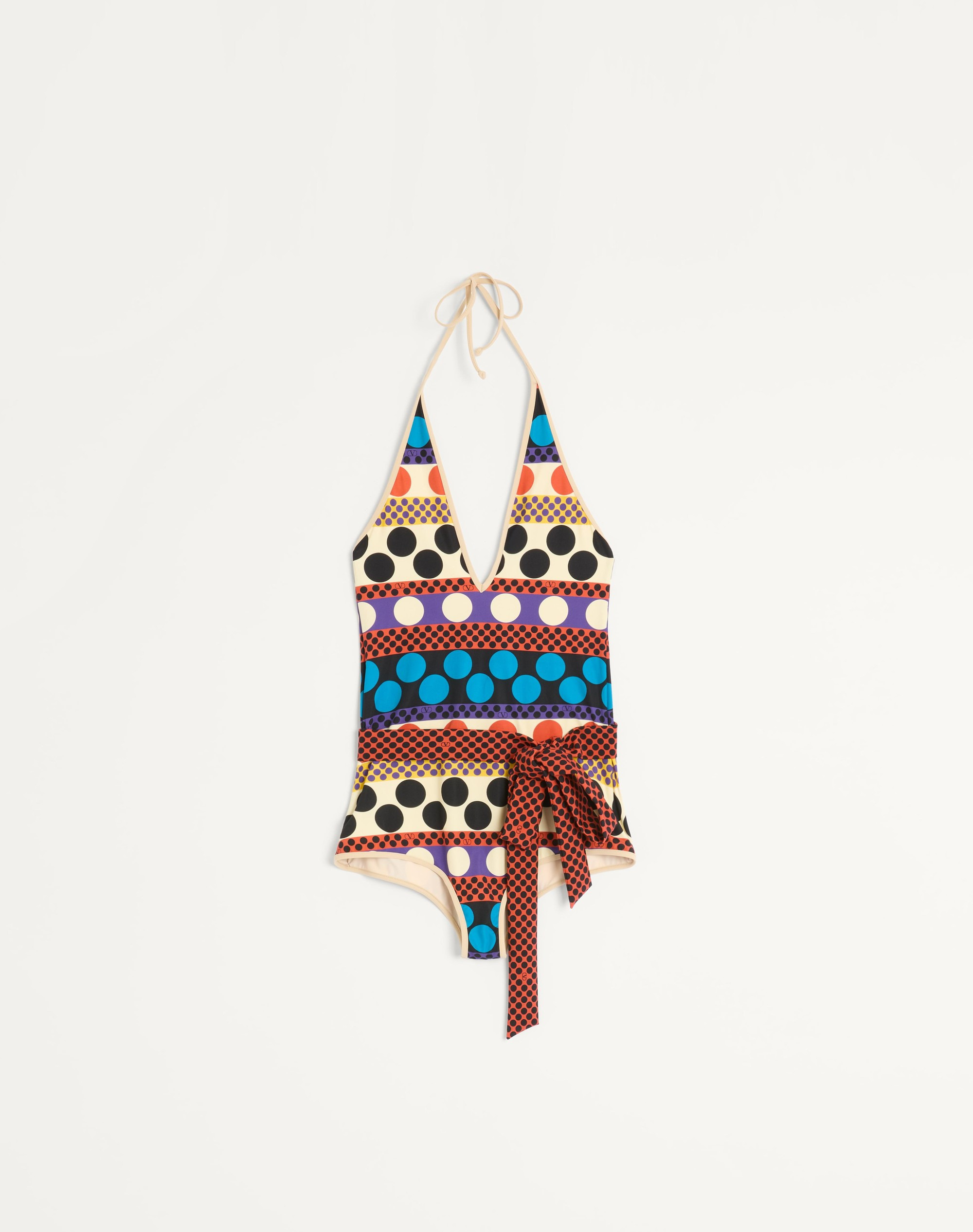 One-piece Lycra swimsuit with Opticool Riga Pois print - Belt detail - V Gold detail on the back - Lycra (84% Polyamide, 16% Elastane) - The model is 176 cm / 5'9" tall and wears an Italian size S - Made in Italy Product code: 7B3UHAB19P6_M12