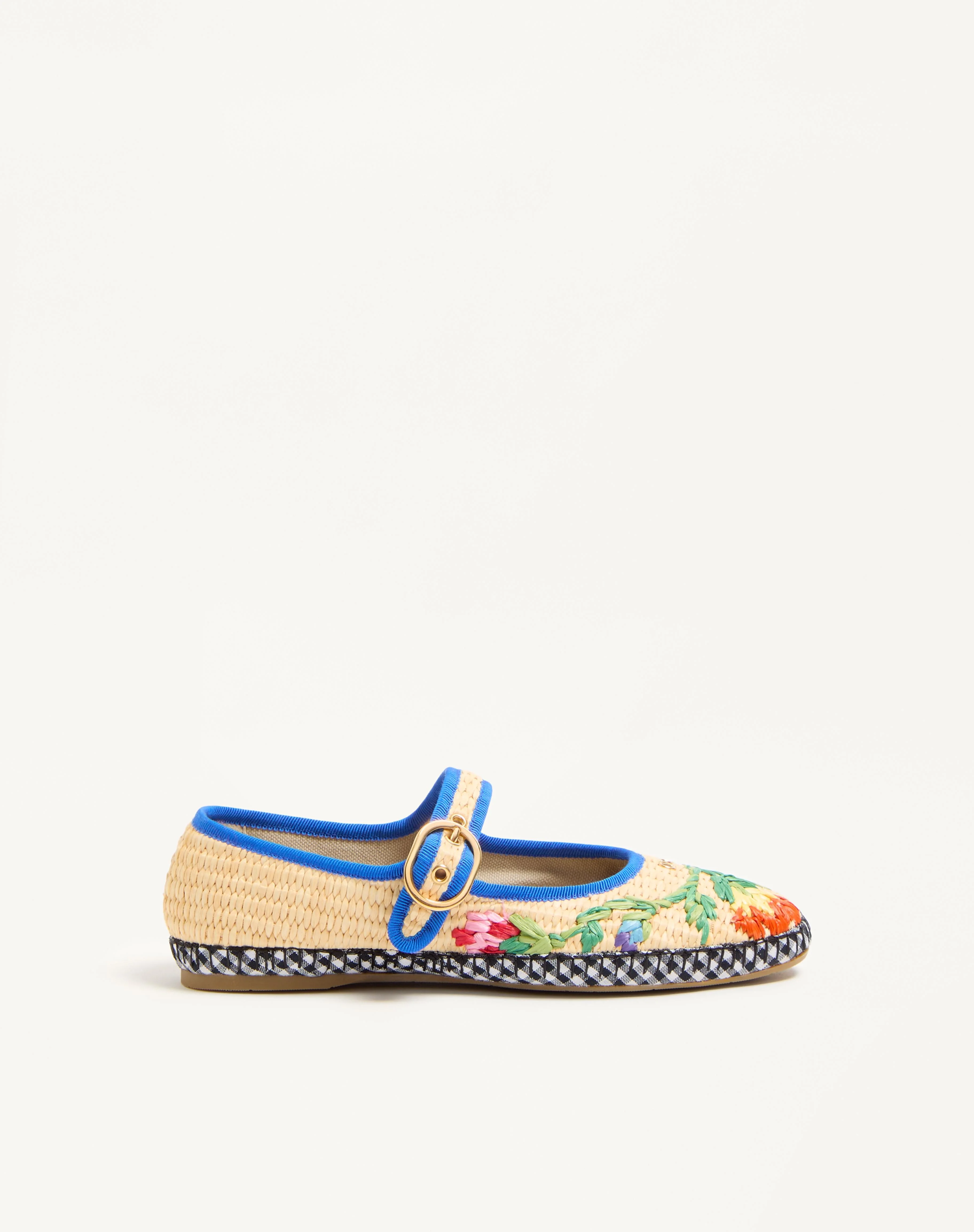 MARY-JANE ENDOUCE BALLERINA IN RAFFIA WITH FLORAL EMBROIDERY
