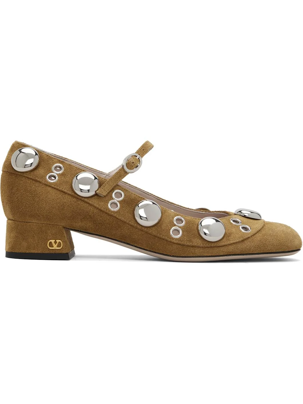 Suede Mary Jane-style heels. · Square toe · Studs and rivets at vamp and sides · Pin-buckle strap at vamp · Buffed leather lining · Logo hardware at block heel with rubber injection · Leather sole Supplier color: Havana beige Leather. Made in Italy 252807F122023