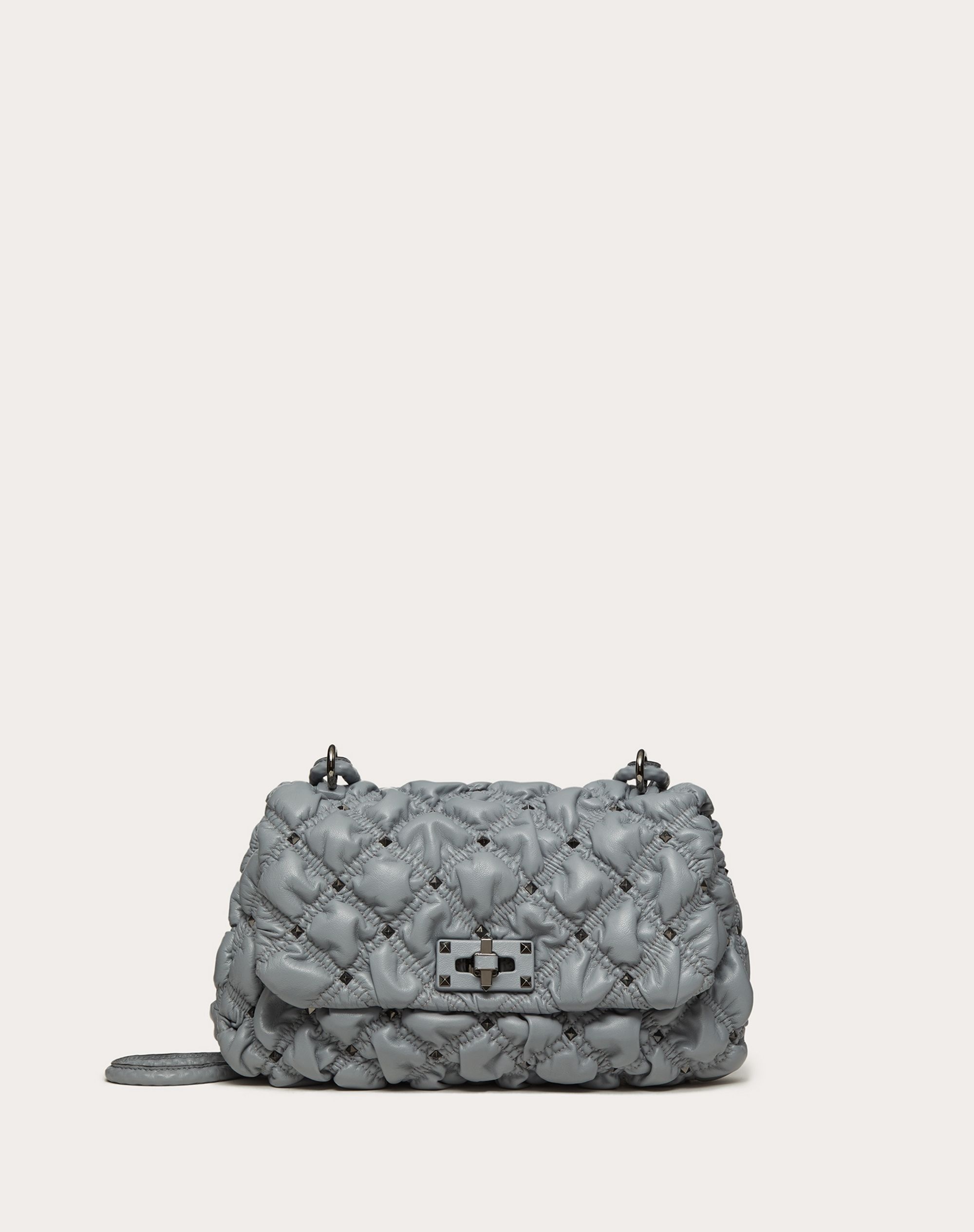 Medium Valentino Garavani SpikeMe Chain Bag in embossed nappa with rhombus pattern, embellished with small studs. Equipped with a detachable sliding leather-covered chain strap, this accessory can be worn as a crossbody/shoulder bag. - Embossed nappa. Rhombus pattern outlined with tone-on-tone stitching - Ruthenium-finish metal studs and hardware - Flap with twist-lock closure - Detachable sliding leather-covered chain strap - Nappa lining. - Interior: zipper pocket and flat pocket - Dimensions: W23xH13xD12 cm / W9.1xH5.1xD4.7 in. - Made in Italy Product Code: VW2B0H78EFZJ6M