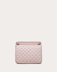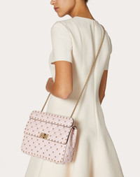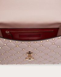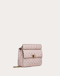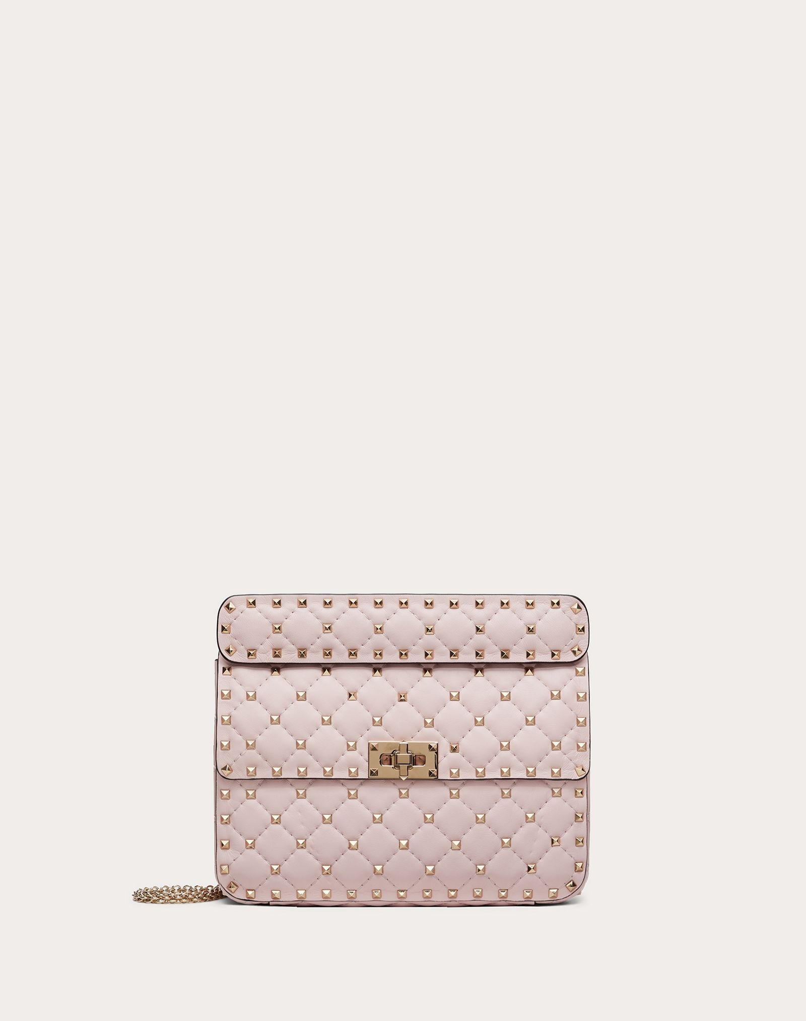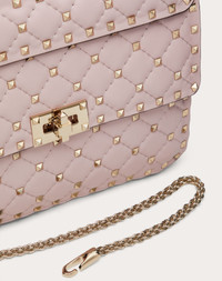 Medium Valentino Garavani Rockstud Spike chain bag in supple lambskin nappa. Quilted construction enriched with small studs. Equipped with a detachable handle and sliding chain strap, this accessory can be worn as a crossbody/shoulder bag or carried by hand. - Quilted nappa. Rhombus pattern enhanced by tone-on-tone stitching - Platinum-finish metal studs and hardware - Flap with twist-lock closure - Nappa lining. Interior: red leather zipper pocket - Dimensions: W23xH16xD6.5 cm / W9.1xH6.3xD2.in. - Made in Italy
