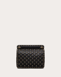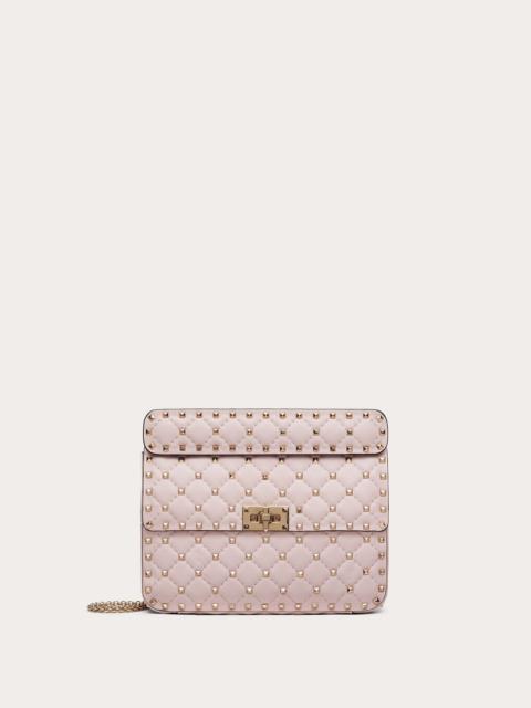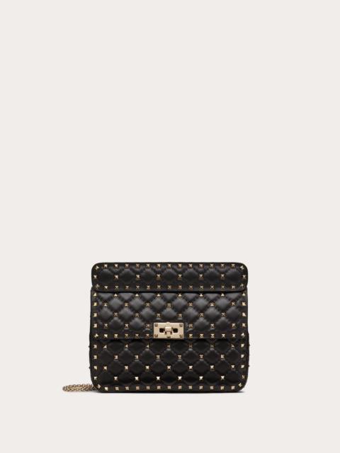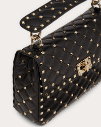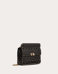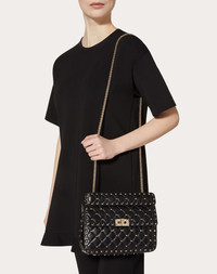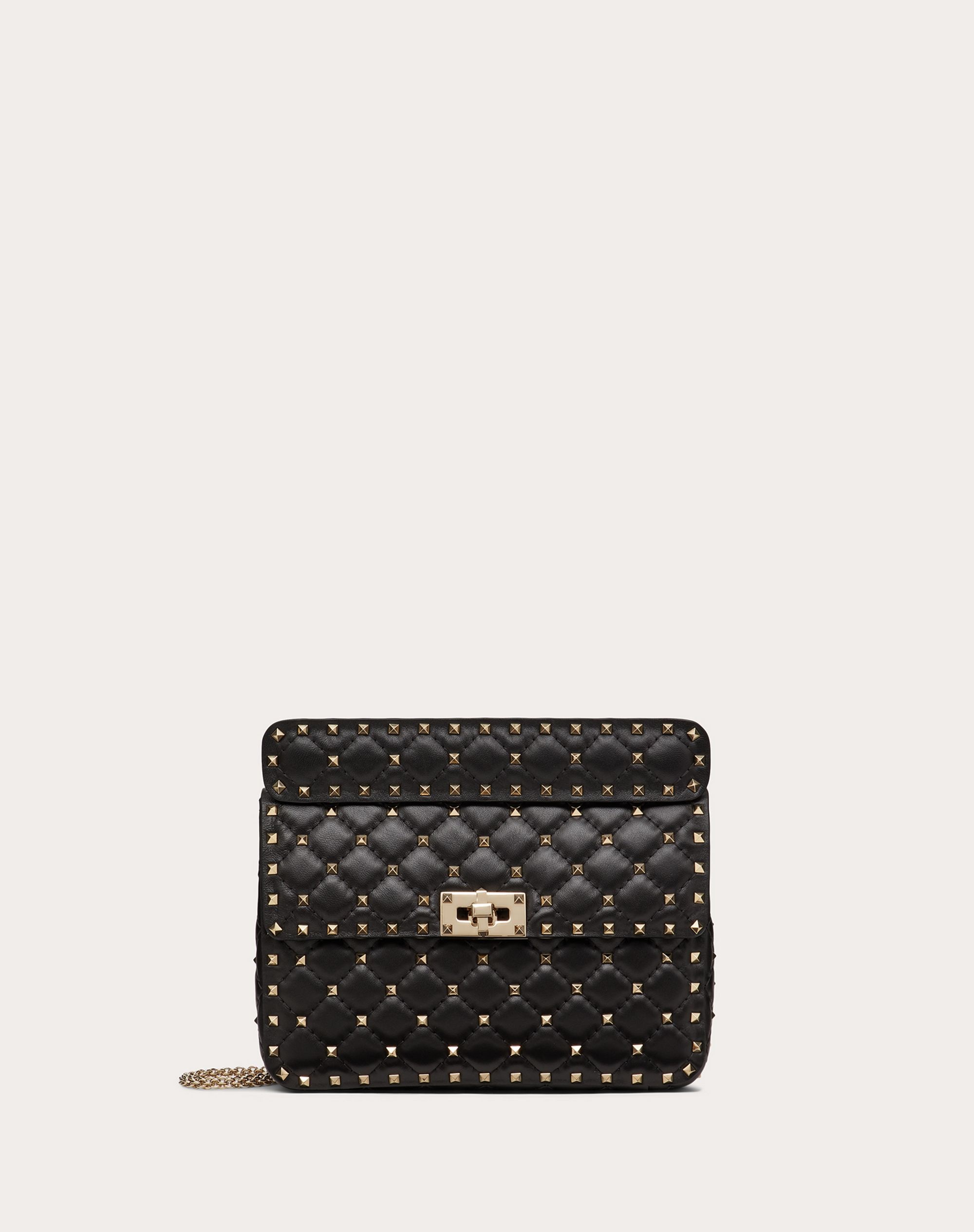 Medium Valentino Garavani Rockstud Spike chain bag in supple lambskin nappa. Quilted construction enriched with small studs. Equipped with a detachable handle and sliding chain strap, this accessory can be worn as a crossbody/shoulder bag or carried by hand. - Quilted nappa. Rhombus pattern enhanced by tone-on-tone stitching - Platinum-finish metal studs and hardware - Flap with twist-lock closure - Nappa lining. Interior: red leather zipper pocket - Dimensions: W23xH16xD6.5 cm / W9.1xH6.3xD2.in. - Made in Italy Product Code: VW2B0122NAP0NO_
