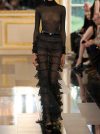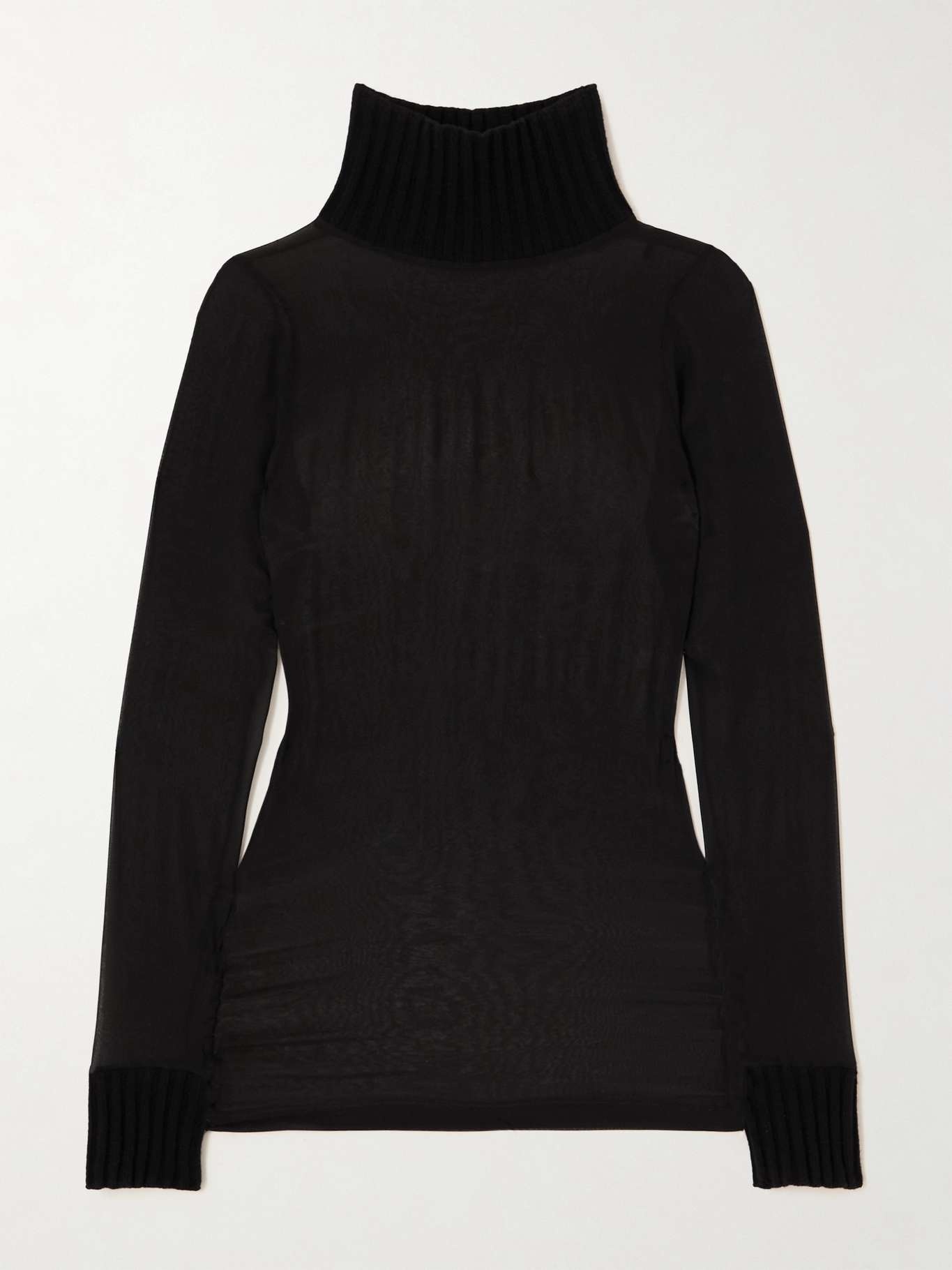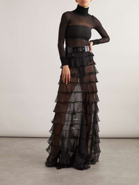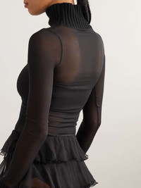 EDITORS'NOTES Valentino Garavani's Fall '24 collection uses delicate fabrics and an all-black palette to juxtapose between "lightness and toughness". Debuted on the runway, this top is cut from sheer mesh for a close fit and has a rib-knitted turtleneck. Underpin yours with a tonal bralette for coverage and style it with the ruffled maxi skirt. SIZE & FIT Model measurements: - Fits small to size, take one size larger than normal - Intended for a very close fit - Lightweight, sheer, slightly stretchy fabric - Model is 177cm/ 5'10", normally wears an IT 40 and is wearing an IT 42 - Bust: 85cm/ 33.5” - Waist: 65cm/ 25.5” - Hip: 91cm/ 36” DETAILS & CARE - Black mesh and ribbed-knit - Slips on - 85% viscose, 15% elastane Small to size. See Size & Fit notes.