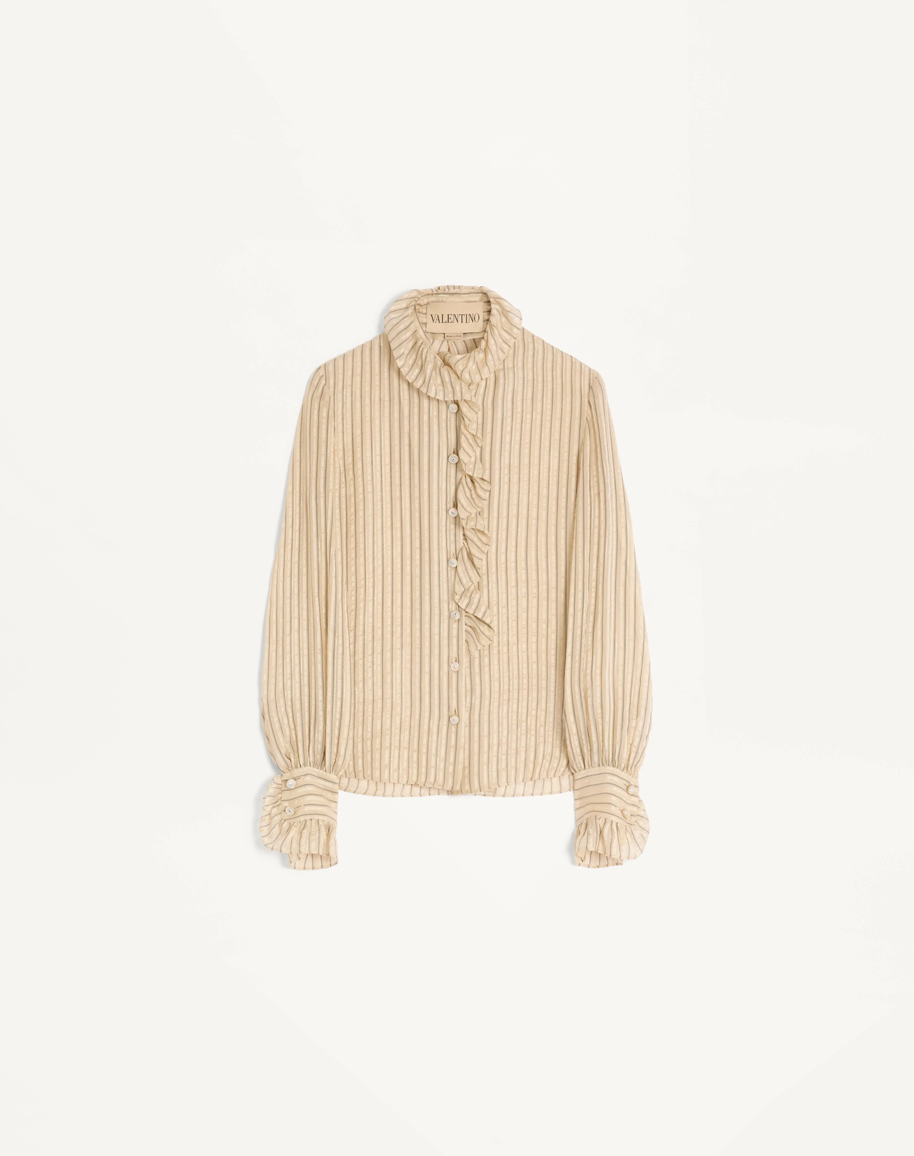 Seersucker Lame Shirt with Stripetease pattern - Ruffle detail along the edges and cuffs - Front button closure - Seersucker Lame Stripetease Stripe (95% Silk, 5% Metallic Fiber) - Length: 60 cm / 23.6 in. from the shoulders in an Italian size 40 - The model is 176 cm / 5'9" tall and wears an Italian size 40 - Made in Italy The look of the model is completed by a Valentino Garavani Panthea Bag and Valentino Garavani Panthea Shoes. Product code: 7B0AB7Y69SU_BX2