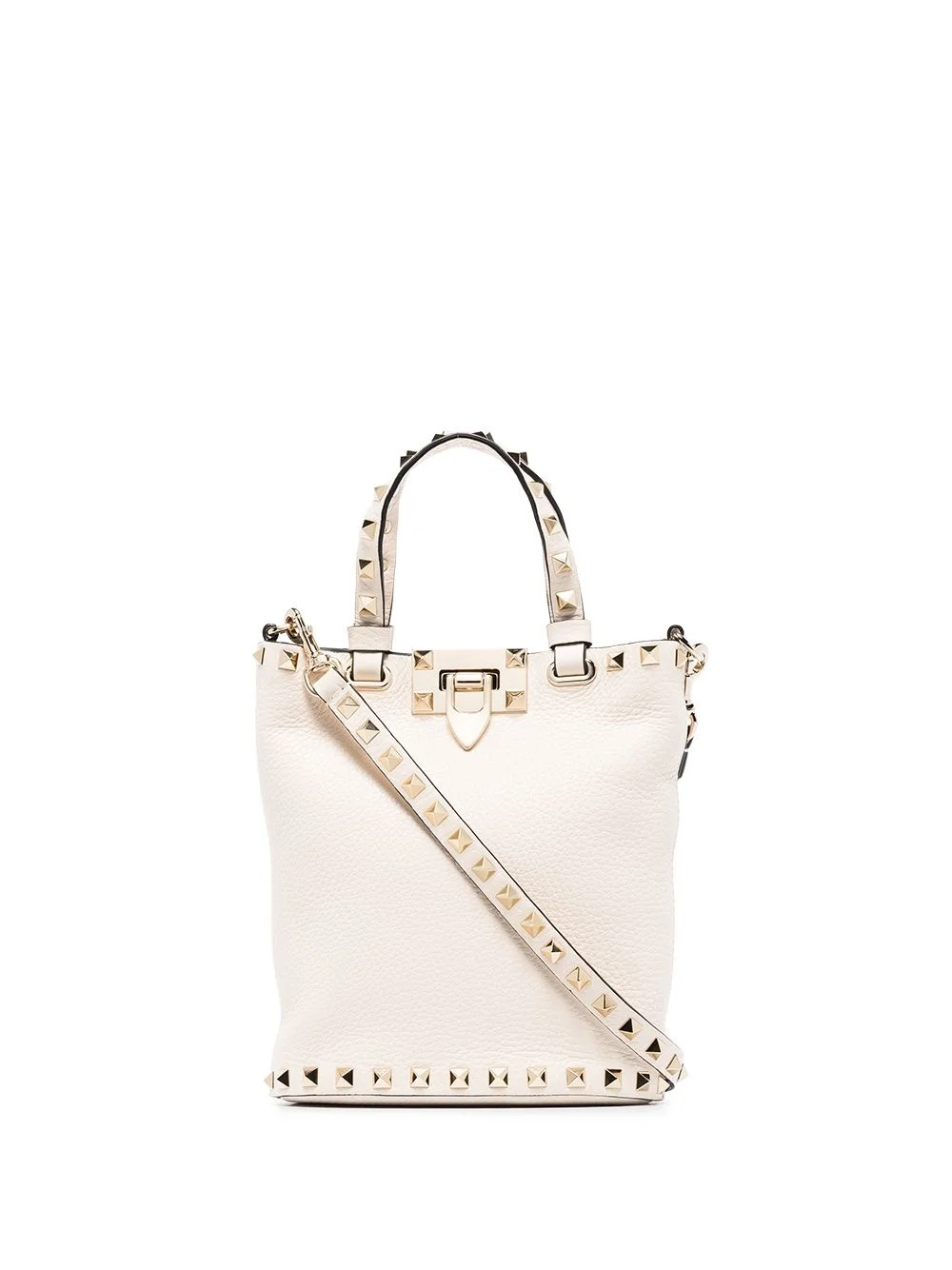 Rockstud leather crossbody bag Valentino Garavani's iconic Rockstud hardware adorns this small bucket bag from the house's AW21 collection. With rounded top handles and a signature flip-lock fastening at the front, this light ivory accessory features an embossed logo at the rear and a practical strap that allows it to be worn across the body, on the shoulder or handheld. Highlights - Ivory tone - Leather - Gold-tone rockstud detailing - Grained texture - Adjustable detachable shoulder strap - Two top handles - Flip-lock fastening - Gold-tone logo lettering Made in Italy Composition Lining: Calf Leather 100%, Viscose 100% Outer: Calf Leather 100%, Zamak 100%, Metal 100% SIZE & FIT Model measurements Height 5 ft 9 in(1.76 m) Bust/Chest 32.28 in(82 cm) Hips 37.4 in(95 cm) Waist 25.59 in(65 cm) Measurement DEPTH 3.14 in(8 cm) HEIGHT 7.48 in(19 cm) WIDTH 7.08 in(18 cm) Washing instructions Read Manufacturer Guidelines