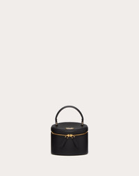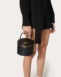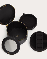 Valentino Garavani Vlogo Signature mini jewelry vanity case in calfskin. Equipped with a top handle, the case can be carried as a handbag. - Light gold-tone finish logo and hardware - Zipper closure - Removable mirror - Nappa leather lining. Interior: two removable jewelry compartments lined with Alcantara - Leather handle. Drop length: 7 cm / 2.7 in. - Dimensions: W14xH12(max),H9(min)xD14 cm / W5.5xH4.7 (max),H3.5 (min)xD5.5 in. - Made in Italy Product code: 4W0P0AC1MIM_0NO