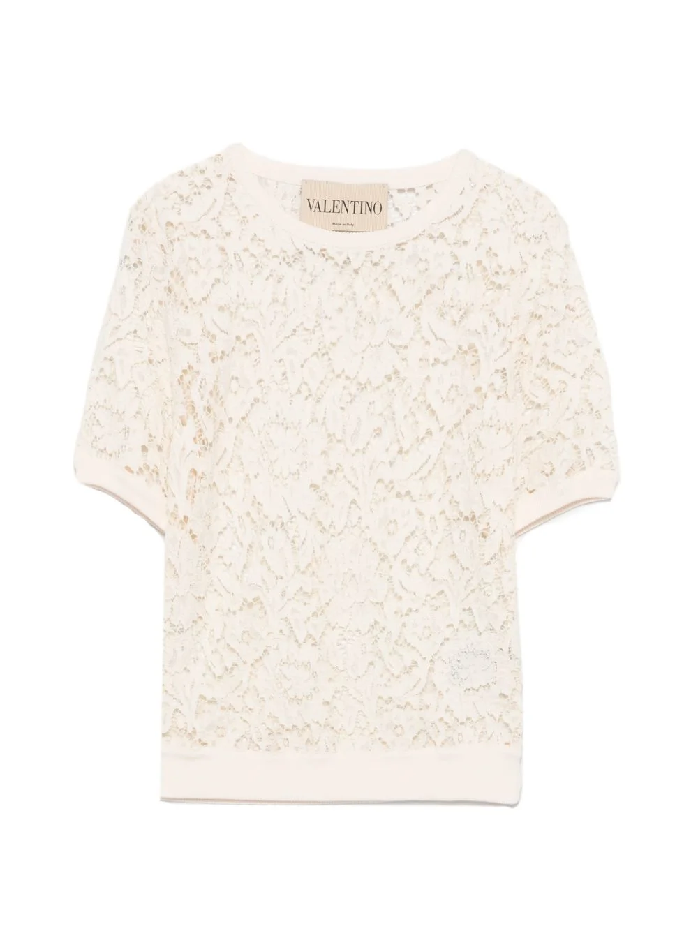 lace knitwear Highlights - Beige - Lace - Short sleeves - Round neck - Ribbed hem - Ribbed cuffs Made in Italy Composition Viscose 42%, Cotton 33%, Polyamide 20%, Elastane 5% Washing instructions Dry Clean Only