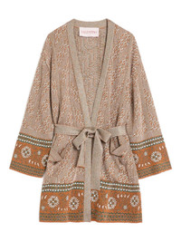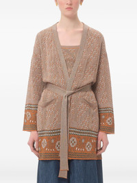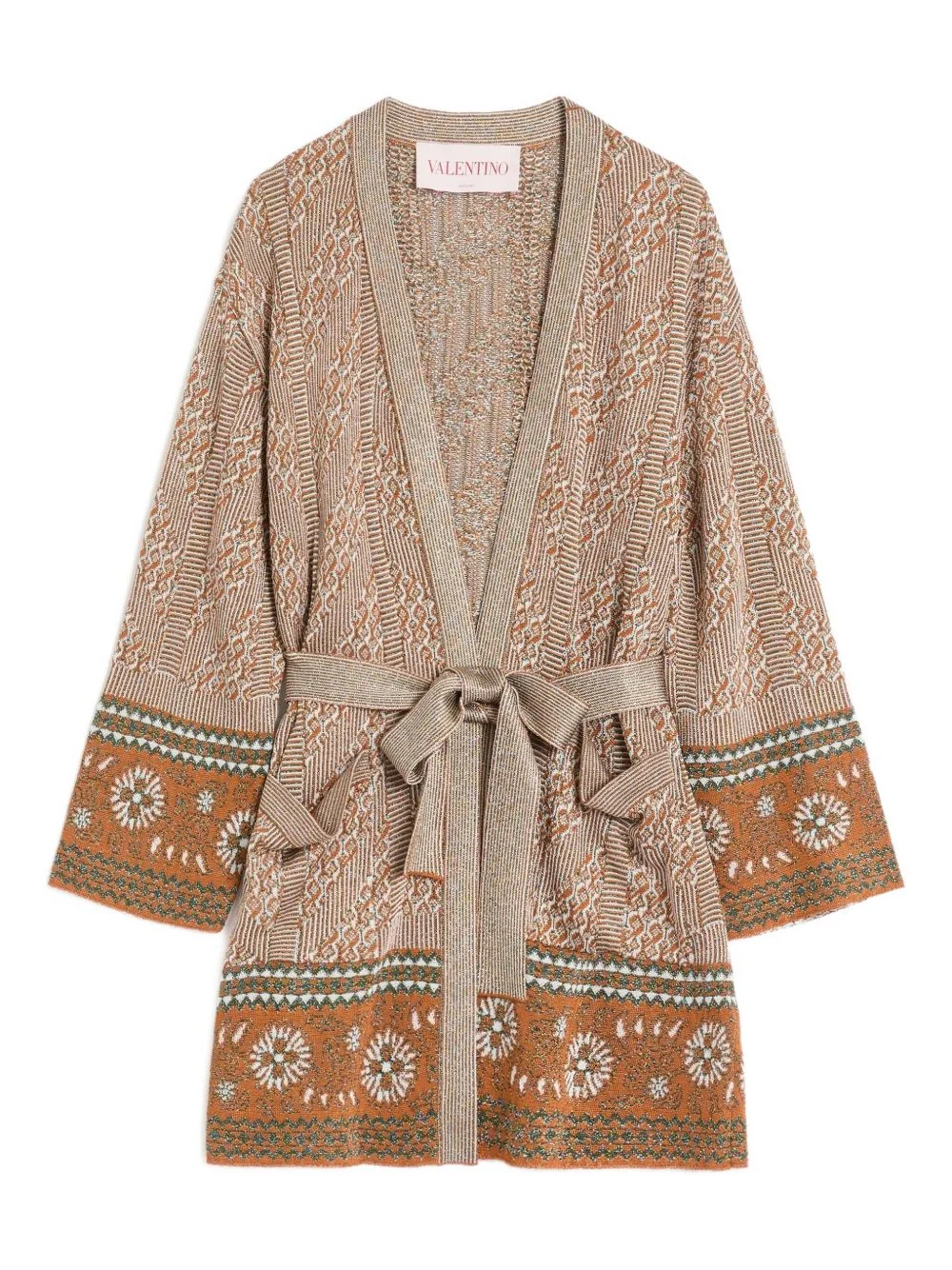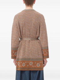 jacquard-pattern lurex cardigan Highlights - Burnt orange - Open front - Detachable and adjustable waist belt - Two front jetted pockets - Drop shoulder Made in Italy Composition Viscose 92%, Fabric 8%