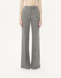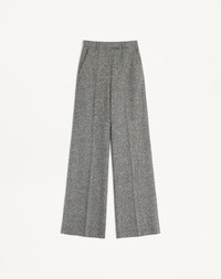 Palazzo pants in natte buttoned weave with frayed hem - Front button and front zipper closure - Natte buttoned weave (85% Virgin Wool, 15% Polyamide ) - Half cotton lining (100% Cotton) - Length: 125 cm / 49.2 in. from the waist in an Italian size 40 - Leg opening: 33 cm / 12.9 in. in an Italian size 40 - The model is 176 cm / 5'9" tall and wears an Italian size 40 - Made in Italy The look of the model is completed by a Valentino Garavani Panthea Bag and Valentino Garavani Panthea Shoes. Product code: 7B0RB6S09R2_0AN