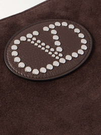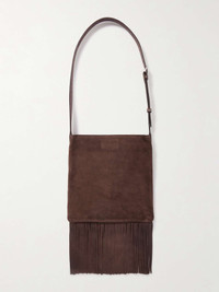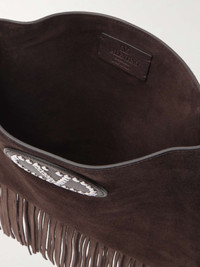 EDITORS'NOTES Valentino Garavani's Resort '25 collection is a festival of textures. This 'Nellcote' bag is made from suede with a studded monogram and a bohemian fringe at the bottom. It's small and slim, with room for a phone, cardholder and keys. SIZE & FIT This item’s measurements are: - Min. Strap Length: 94cm / 37in - Depth: 2cm / 0.8in - Max. Strap Length: 104cm / 40.9in - Height: 48cm / 18.9in - Width: 30cm / 11.8in DETAILS & CARE - Dark-brown suede and leather (Cow) - Adjustable shoulder strap - Fully lined - Open top - Weighs approximately 2lbs/ 0.9kg