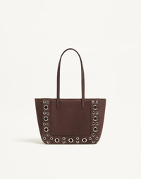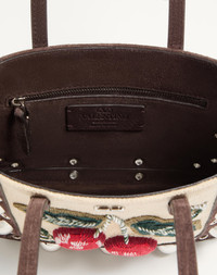 Valentino Garavani Nellcote mini shopping bag in suede with Cherryfic 3D embroidery on a linen base. Suede profile decorated with ball studs and rivets. - Main composition: linen, suede, cotton, cotton yarn, viscose yarn - Palladium-finish hardware - Small metallic detail with VLogo Signature - Suede lining. Interior: zipper pocket - Handle drop length: 18 cm / 7.1 in. - Dimensions: W21xH16xD5 cm / W8.3xH6.3xD2.0 in. - Made in Italy This product contains magnets. Please consider if this product will be worn within 15 cm from any implanted device. Any concerns please contact your healthcare professional. Product code: 7W2B0R89HCB_AYG