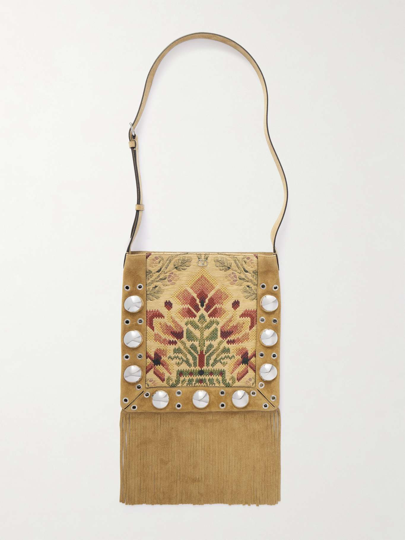 Nellcôte fringed studded eyelet-embellished jacquard and suede tote