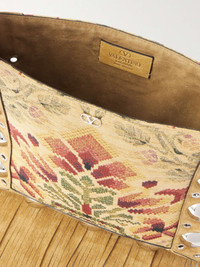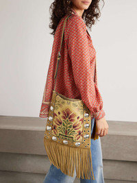Valentino Garavani's 'Nellcote' bag has silver-tone stud and eyelet embellishments, as well as long fringing along the bottom that gives it a retro, bohemian-inspired feel. It's been crafted in Italy from suede and jacquard-woven with tapestry-inspired flowers. The medium size offers plenty of room for your phone, sunglasses and water bottle inside. Details & Care - Brown suede (Calf), multicolored jacquard - Adjustable shoulder strap - Suede lining - Open top