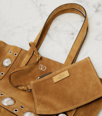 The Nellcote Medium tote bag from Valentino Garavani is crafted from smooth suede. This accessory is embellished with ball studs and rivets, complemented by a removable interior pouch and a silver-toned VLogo signature. Product Details - Material: leather (suede) - Lining: unlined - Made in Italy - Designer color name: Havana Beige - Item color: beige - Internal details: internal zipped pouch, single compartment - Top handles - Hardware color: silver - Item number: P01056384 Size & Fit - Height 24cm-9.5" - Min. width 30cm-12" - Max. width 35cm-14" - Depth 10cm-4" - Length of handles 47cm-18.5" - Clutch height 13cm-5" - Clutch width 19cm-7.5"