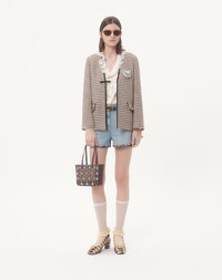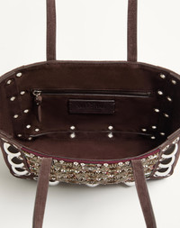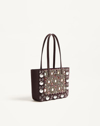 Valentino Garavani Nellcote mini shopping bag with embroidery of resin mirrors and rhinestones. Suede trim decorated with ball studs and rivets. - Palladium-finish hardware - Small metallic detail with VLogo Signature - Interior: zip pocket - Handle drop length: 18 cm / 7 in. - Dimensions: W21xH16xD5 cm / W8.2xH6.2xD1.9 in. - Made in Italy This product contains magnets. Please consider if this product will be worn within 15 cm from any implanted device. Any concerns please contact your healthcare professional. Product code: 7W2B0R89TAA_RCB