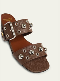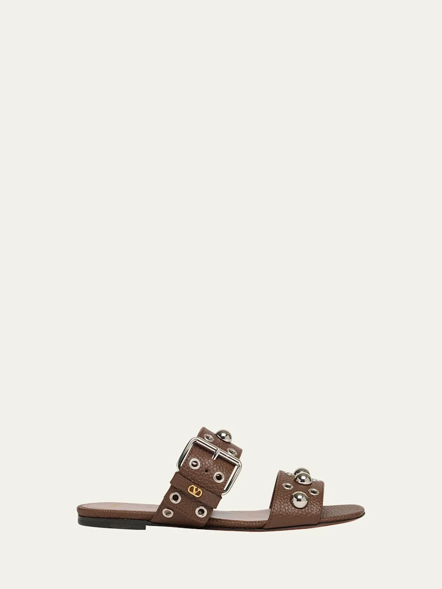 Valentino Garavani "Nellcote" sandals in pebbled leather Flat heel Open toe Dual strap upper with grommet and stud detail Slide style Leather lining and outsole Made in Italy Online Inquiries: BGS21_X6VP5| Store Inquiries: #4996075
